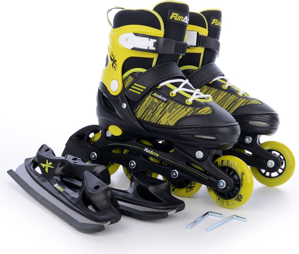 Das ganze Jahr Sport-Spaß! Diese Nils Extreme Spirit Skates verwandeln sich einfach von Inlineskates zu Schlittschuhen. Größe verstellbar von 29-33 - perfekt für wachsende Kinderfüße. Mit ABEC7 Kugellagern für smooths Fahren, Aluminium-Schiene für Stabilität und PU-Rollen für guten Grip. Dreifach-Verschluss: Schnallen, Klett und Schnürung für perfekten Halt. Einfach die Rollenschiene gegen die Kufenschiene tauschen und schon geht's aufs Eis! Ideal für Anfänger und Fortgeschrittene.