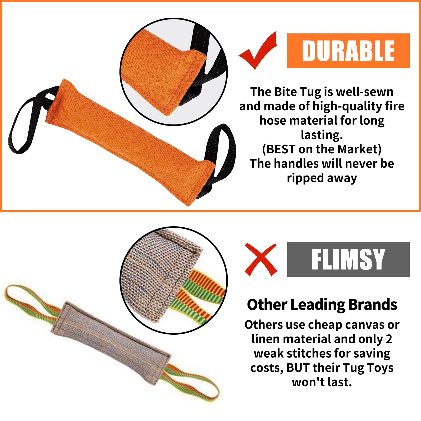 Dein Hund wird diese Beisswürste lieben! Im Set sind 2 Stück enthalten, jeweils 30 cm lang - perfekt für gemeinsames Spielen und Training. Aus hochwertigem Canvas gefertigt, mit verstärkten Nähten und robusten Nylongriffen. So halten die Würste auch den stärksten Hundegebissen stand! Ideal für Tauziehen, Apportierspiele oder Agility-Übungen. Die Handschlaufe gibt dir perfekten Halt, während dein Hund sich austoben kann. Besonders geeignet für energiegeladene Rassen wie Deutsche Schäferhunde, Belgische Malinois oder Pitbulls. Wichtig: Dieses Spielzeug ist für interaktives Spielen und Zerren konzipiert, nicht für langes alleiniges Kauen! Perfekt für das Training von Gehorsamkeit und Beweglichkeit. Ob im Garten, Park oder zu Hause - mit diesen Beisswürsten macht das Training richtig Spaß! Dein Hund bleibt aktiv und fit, während ihr gemeinsam Quality-Time verbringt. Ein Muss für jeden Hundebesitzer, der sein Tier beschäftigen und fördern möchte!
