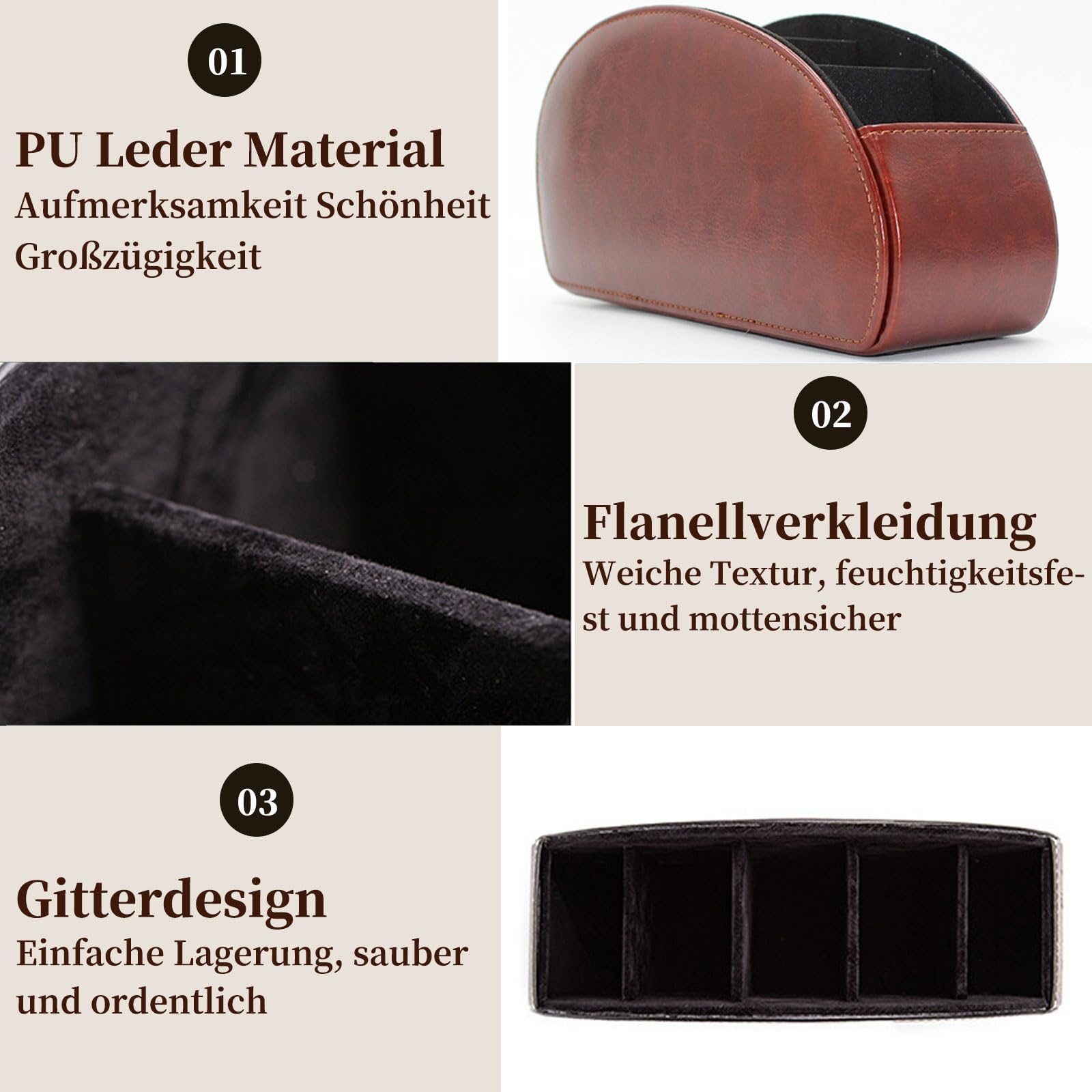 Schluss mit der Fernbedienungs-Suche! Diese beiden stylischen Halter aus schwarzem PU-Leder bringen Ordnung ins Chaos. Mit 5 Fächern pro Halter hast du Platz für alle Fernbedienungen - TV, Soundbar, Klimaanlage, etc. Die weichen Innenfächer schützen vor Kratzern. Maße: 22x12x7,5cm - kompakt aber geräumig. Das elegante Design passt zu jeder Einrichtung. Auch super für Make-up-Pinsel, Stifte oder Bürobedarf. Einfach abwischbar und langlebig. Endlich ein aufgeräumtes Wohnzimmer!