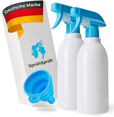 Praktische Sprühflaschen, die jeder Haushalt braucht! Im Set bekommst du zwei 500 ml Flaschen aus robustem Kunststoff, die sich für die verschiedensten Zwecke einsetzen lassen.\\n\\nDer ergonomische Auslöser liegt gut in der Hand und lässt sich leicht drücken. Das besondere Feature: Die Düse ist drei-fach einstellbar! Du kannst zwischen feinem Nebel, kräftigem Strahl und komplett ausgeschaltet wählen - einfach die Düse drehen.\\n\\nDie auslaufsichere Konstruktion mit Edelstahlfeder und Präzisionsventil sorgt dafür, dass nichts daneben geht - selbst wenn du die Flasche auf den Kopf stellst. Die Kappenverschluss-Düse ermöglicht das Sprühen in jedem Winkel.\\n\\nChemikalienbeständig und damit ideal für Reinigungsmittel, Desinfektionslösungen oder Pflanzendünger. Perfekt für die Pflanzenpflege, Haushaltsreinigung, als Haarsprühflasche oder Lufterfrischer. Die weißen, quadratischen Flaschen sehen dabei noch dazu richtig gut aus. Umweltfreundlich, weil nachfüllbar und wiederverwendbar!