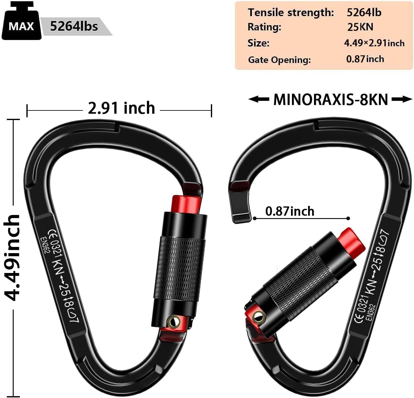 Sichere Ausrüstung für deine Abenteuer! Dieses Set enthält 2 UIAA-zertifizierte Karabiner mit 25KN Bruchlast und 2 Nylonseile mit 23KN. Die Karabiner mit automatischer Verriegelung sind einfach mit einer Hand zu bedienen. Aus superleichtem Flugzeugaluminium 7075 - robust aber leicht. Perfekt für Klettern, Bergsteigen, Schaukeln oder Hängematten. CE-zertifiziert für maximale Sicherheit. Mit 63g Gewicht pro Karabiner minimalisierst du das Gepäckgewicht. Die große Öffnung von 0,6 Zoll ermöglicht vielseitige Anwendungen. Auch für Hundegeschirr oder Outdoor-Camping geeignet. Mit 30-Tage-Rückgaberecht - kaufe mit Vertrauen. Starte sicher in dein nächstes Abenteuer!