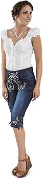Dirndl mal anders! Diese coole Trachtenjeans kombiniert den lässigen Jeans-Comfort mit authentischer Lederhosen-Optik. Als 3/4 Capri-Hose mit High-Waist-Schnitt sitzt sie perfekt und betont deine Figur. Das Stretch-Material gibt dir volle Bewegungsfreiheit - ob beim Tanzen, Feiern oder gemütlichen Beisammensein. Perfekt fürs Oktoberfest, aber auch für Alltag, Dates, Shopping oder Reisen super geeignet. Der Retro-Y2K-Style verleiht deinem Outfit einen modernen Touch, während die traditionelle Optik für echte Bayern-Stimmung sorgt. Du musst dich nicht zwischen Bequemlichkeit und Stil entscheiden - mit dieser Hose hast du beides! Ob zu einem lockeren Oberteil oder einer traditionellen Bluse - diese Trachtenjeans macht immer eine gute Figur und ist dein neuer Liebling für festliche Anlässe und darüber hinaus.