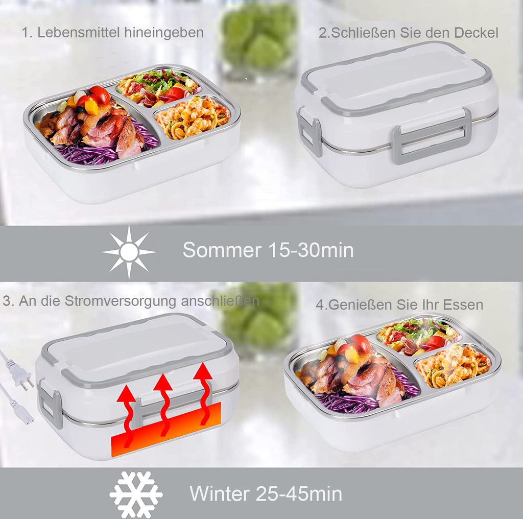 Boah, endlich warmes Essen unterwegs! Diese Czoele elektrische Lunchbox ist ja mal der absolute Game-Changer für alle, die ihr Mittagessen mit zur Arbeit nehmen! Mit 1,8L Fassungsvermögen ist genug Platz für dein komplettes Meal! Das doppelte Gitter-Design und die 100W Heizleistung sorgen dafür, dass dein Essen in 20-30 Minuten perfekt warm ist! Das Beste: Die Box funktioniert mit 12V/24V im Auto UND mit 220V im Büro oder zu Hause - einfach den passenden Stecker anschließen und los geht's! Aus lebensmittelechtem PP-Kunststoff und 304 Edelstahl ist sie nicht nur sicher, sondern auch super leicht zu reinigen! Mit der beiliegenden Edelstahlgabel und dem Löffel hast du immer Besteck dabei! Perfekt für Berufspendler, LKW-Fahrer oder einfach für alle, die kein kaltes Essen mehr mögen! Also, Schluss mit der Mikrowellen-Schlange im Pausenraum - hol dir diese Lunchbox und genieß immer warmes, gesundes Essen wann und wo du willst!