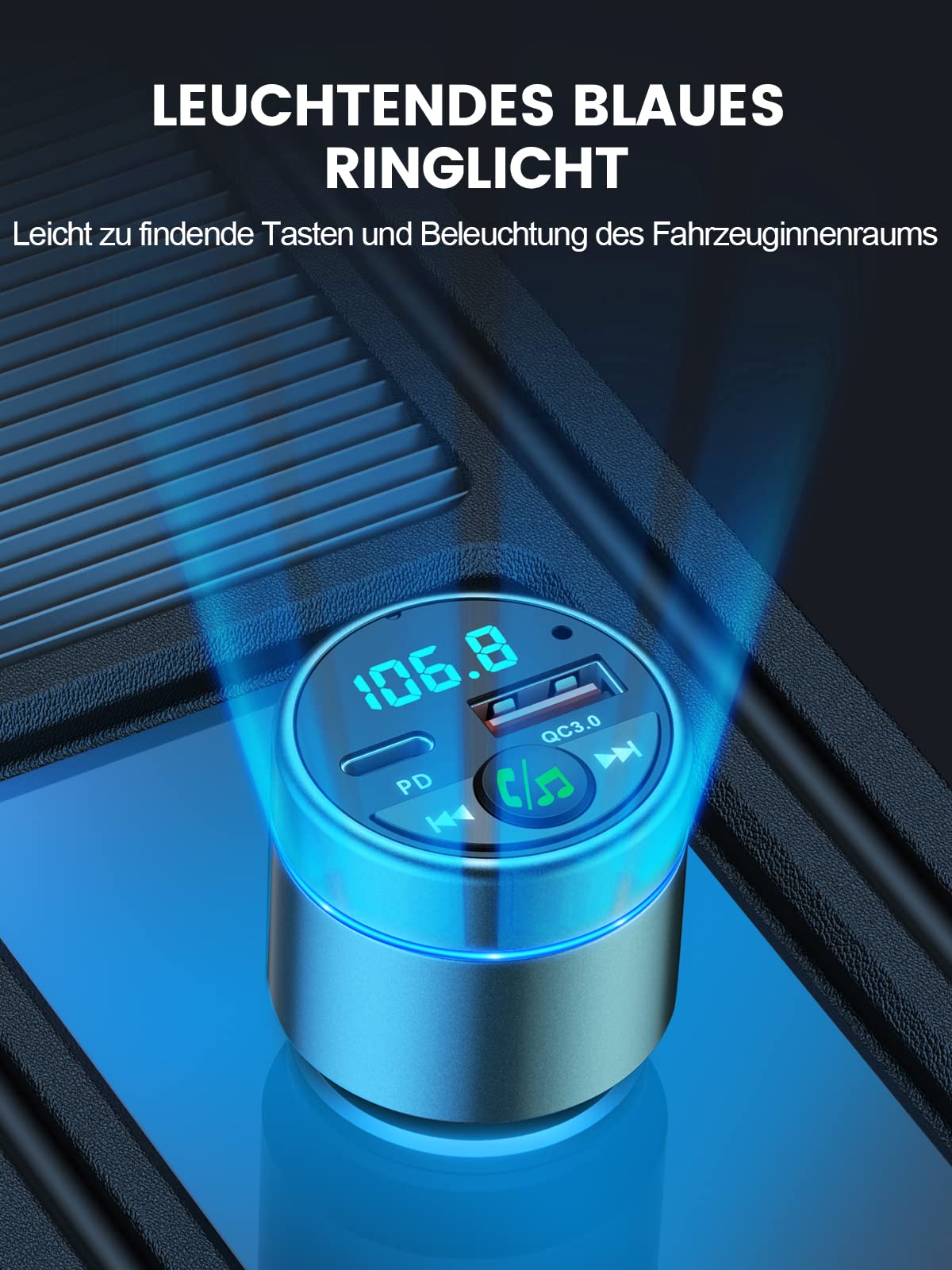 Upgrade dein Auto-Soundystem! Der Mohard FM-Transmitter bringt modernste Technik in jedes Auto - selbst Oldtimer! Mit Bluetooth 5.3 für stabile Verbindung und Hi-Fi Musik ohne Verluste. Die doppelte Schnellladung bietet 18W USB-A QC3.0 und 30W USB-C PD - deine Geräte sind in 30 Minuten bei 80%! Das vollständige Metallgehäuse aus Zinklegierung sieht nicht nur edel aus, sondern sorgt für beste Wärmeableitung. Das rauschunterdrückende Mikrofon macht Freisprechanrufe kristallklar. Einfach in den Zigarettenanzünder stecken, FM-Frequenz einstellen und schon streamst du Musik von deinem Smartphone. Überwacht sogar die Autospannung! Der blaue Lichtring hilft bei Dunkelheit. Perfekt für Navigation, Sprachassistenten und deine Lieblingsplaylists - auch in Autos ohne Bluetooth!