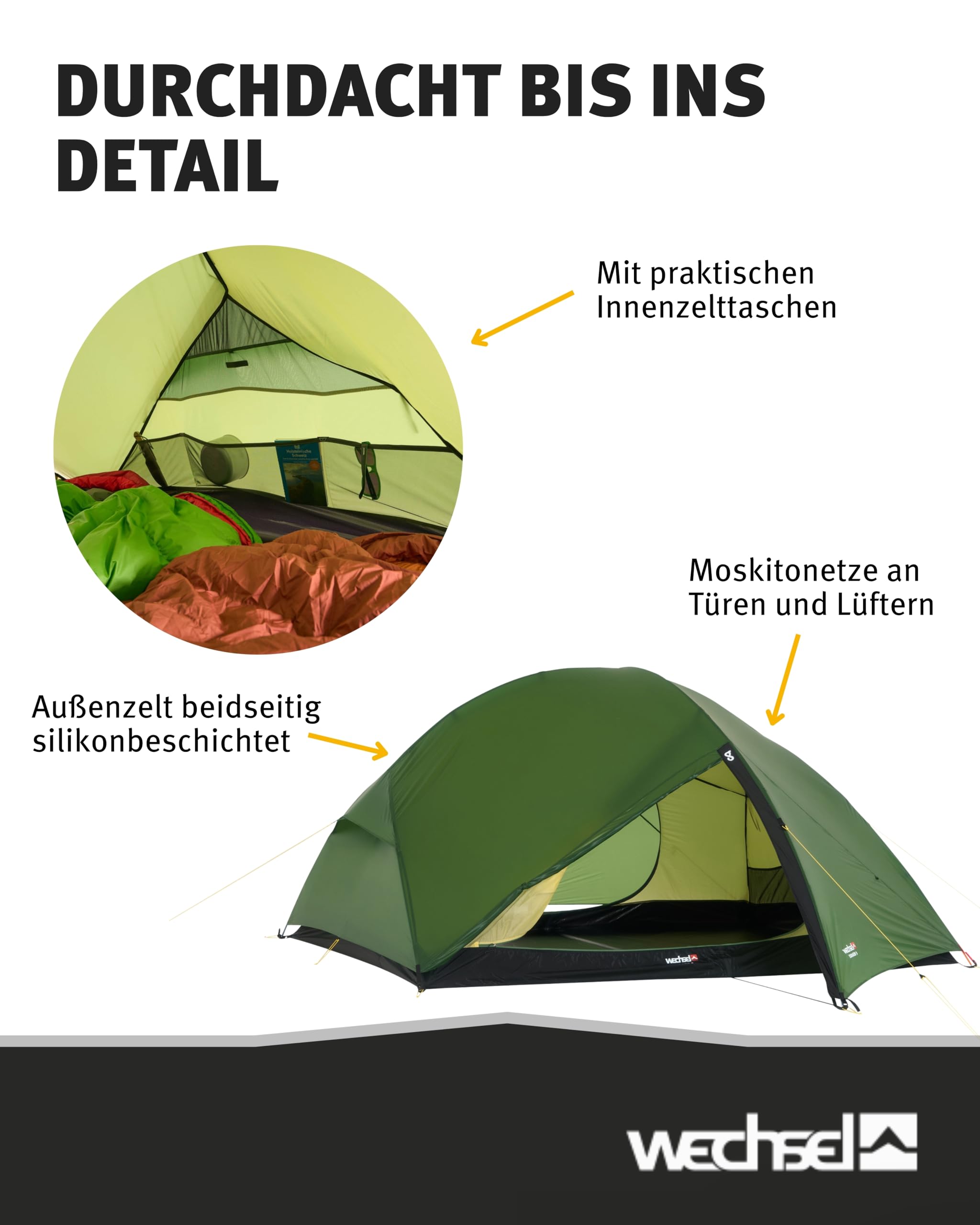 Das Wechsel Charger 3 ist dein perfekter Begleiter für Outdoor-Abenteuer! Als freistehendes Kuppelzelt bietet es Platz für bis zu 3 Personen mit einer geräumigen Liegefläche von 220x170cm und einer komfortablen Sitzhöhe von 110cm. Mit nur 3,2kg Gewicht und einem kompakten Packmaß von Ø19x58cm ist es ideal für Wanderungen, Radtouren oder Camping-Ausflüge. Besonders praktisch: Die zwei großen Apsiden mit 90cm Tiefe bieten jede Menge Stauraum für Gepäck und Ausrüstung. Durch die speziellen Aluminium-Knotenpunkte am Gestänge steht das Zelt bombenfest, auch bei windigem Wetter. Die großflächigen Moskitonetze sorgen für optimale Belüftung ohne unangenehmen Zug. Das Innenzelt kann alleine bei schönem Wetter genutzt werden, bei Regen kommt einfach das wasserdichte Außenzelt darüber (5000mm Wassersäule). Der Boden hat sogar 7000mm Wassersäule - da bleibt alles trocken! Seit über 30 Jahren steht Wechsel für qualitativ hochwertige Zelte, die wirklich halten, was sie versprechen. Ob Wochenendtrip oder längere Trekking-Tour - mit diesem Zelt bist du bestens ausgerüstet!