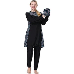Endlich unbeschwert ins Wasser! Dieser stylische Burkini von FOKULUNDA besteht aus drei Teilen: Hijab, Top mit langen Ärmeln und Hose. Aus 80% Polyester und 20% Spandex ist der Stoff super leicht, trocknet schnell und bietet 50+ SPF/UPF Sonnenschutz. Das Top hat sogar abnehmbare Brusteinsätze und einen praktischen Bindezug damit nichts verrutscht. Perfekt für Schwimmen, Surfen, Tauchen oder Wassergymnastik - du bist vor Sonne, Quallen und anderen Reizungen geschützt. In vielen Größen von XS bis 6XL erhältlich, also für jede Figur geeignet. Wichtig: Vor dem Kauf unbedingt die Größentabelle checken und besonders auf den Brustumfang achten! So kannst du mit gutem Gefühl jeden Strandtag genießen.