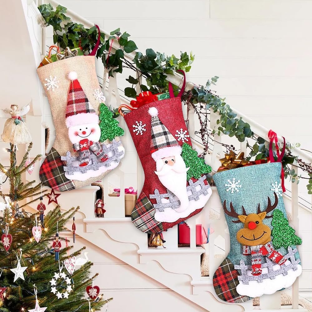 Weihnachtliche Stimmung garantiert mit diesem niedlichen Strumpf-Set! Drei wunderschöne Weihnachtsstrümpfe mit Santa, Rentier und Schneemann Motiven - alle in klassischem Rot-Weiß. Jeder Strumpf ist 18 Zoll (ca. 45cm) groß und bietet genug Platz für Süßigkeiten, kleine Geschenke oder Überraschungen. Hergestellt aus weichem Filzstoff mit glattem Innenfutter, damit die Geschenke nicht hängen bleiben. Die gestickten Motive sehen super lebendig und dreidimensional aus. Perfekt für den Kamin, Weihnachtsbaum oder die Wanddekoration. Ob für zu Hause, Schule oder Hotel - diese Strümpfe bringen überall festliche Stimmung. Ein Muss für jede Weihnachtsdekoration!
