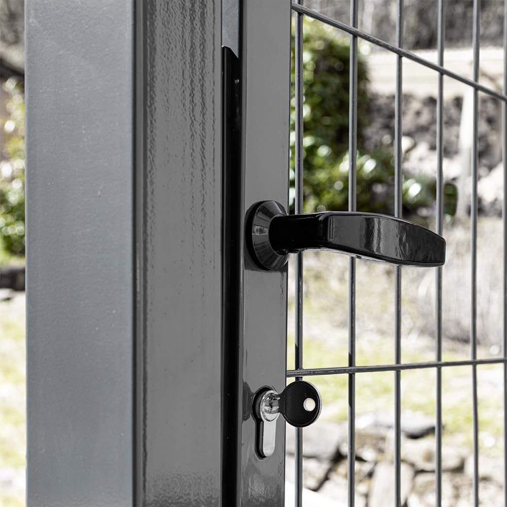 Endlich ein sicheres Tor für deinen Garten! Dieses V2Aox Gartentor in 300x160cm ist perfekt für deine Grundstücksbegrenzung. Das Doppelflügel-Design sieht nicht nur klasse aus, sondern ist auch super praktisch. Mit den Maßen 160cm Höhe und 141cm Breite pro Flügel bietet es genug Durchgang für Schubkarren und Gartengeräte. Die Pfosten sind 210cm hoch und werden einfach 40cm tief einbetoniert - so steht das Tor bombenfest! Die Maschenweite von 195x50mm passt perfekt zu Doppelstabmattenzäunen. In Anthrazit (RAL 7016) lackiert, hält das Tor jeder Witterung stand - ob Regen, Schnee oder Sonne. Im Lieferumfang ist alles dabei: Tor, Türgriff-Set, 3 Schlüssel und Befestigungsschellen. Perfekt um Kinder und Haustiere sicher im Garten zu halten, oder einfach um dein Eigentum zu schützen. Einfach montieren und jahrelang Freude an deinem neuen Gartentor haben!