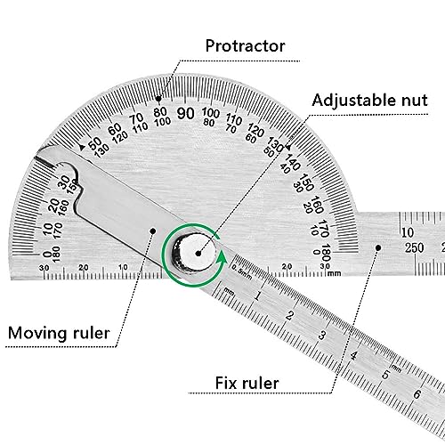 Mann, dieser Winkelmesser aus Edelstahl ist ein richtig praktisches Werkzeug! 30 cm lang (11,8 Zoll) und in silber - sieht nicht nur gut aus, sondern ist auch super funktional.\n\n2-in-1 Design: Funktioniert als Lineal von 0-30 cm UND als Winkelmesser von 0-180 Grad. Musst nicht zwischen verschiedenen Werkzeugen wechseln.\n\nDie Winkelarme sind verstellbar und lassen sich mit einer Flügelmutter arretieren. Einfach den gewünschten Winkel einstellen, Mutter festziehen - und du hast deine Vorlage.\n\nAus rostbeständigem Edelstahl - verformt sich nicht und hält ewig. Perfekt für die Werkstatt oder Baustelle.\n\nLasergravierte Skalen - sowohl metrisch als auch in Zoll. Super präzise und leicht ablesbar. Verblassen nicht mit der Zeit.\n\nIdeal für Tischler, Mechaniker, Heimwerker oder Schüler. Zum Messen von Winkeln, Übertragen von Schrägen oder für präzise Zeichnungen.\n\nLiegt gut in der Hand und ist nicht zu schwer. Passt in jede Werkzeugtasche oder Schublade.\n\nVon NORTOOLS - Qualität die man kennt. Ein unverzichtbares Werkzeug für jeden der genau arbeiten will.\n\nOb für Möbelbau, Metallarbeiten oder Bastelprojekte - mit diesem Winkelmesser machst du keine Fehler bei den Winkeln!