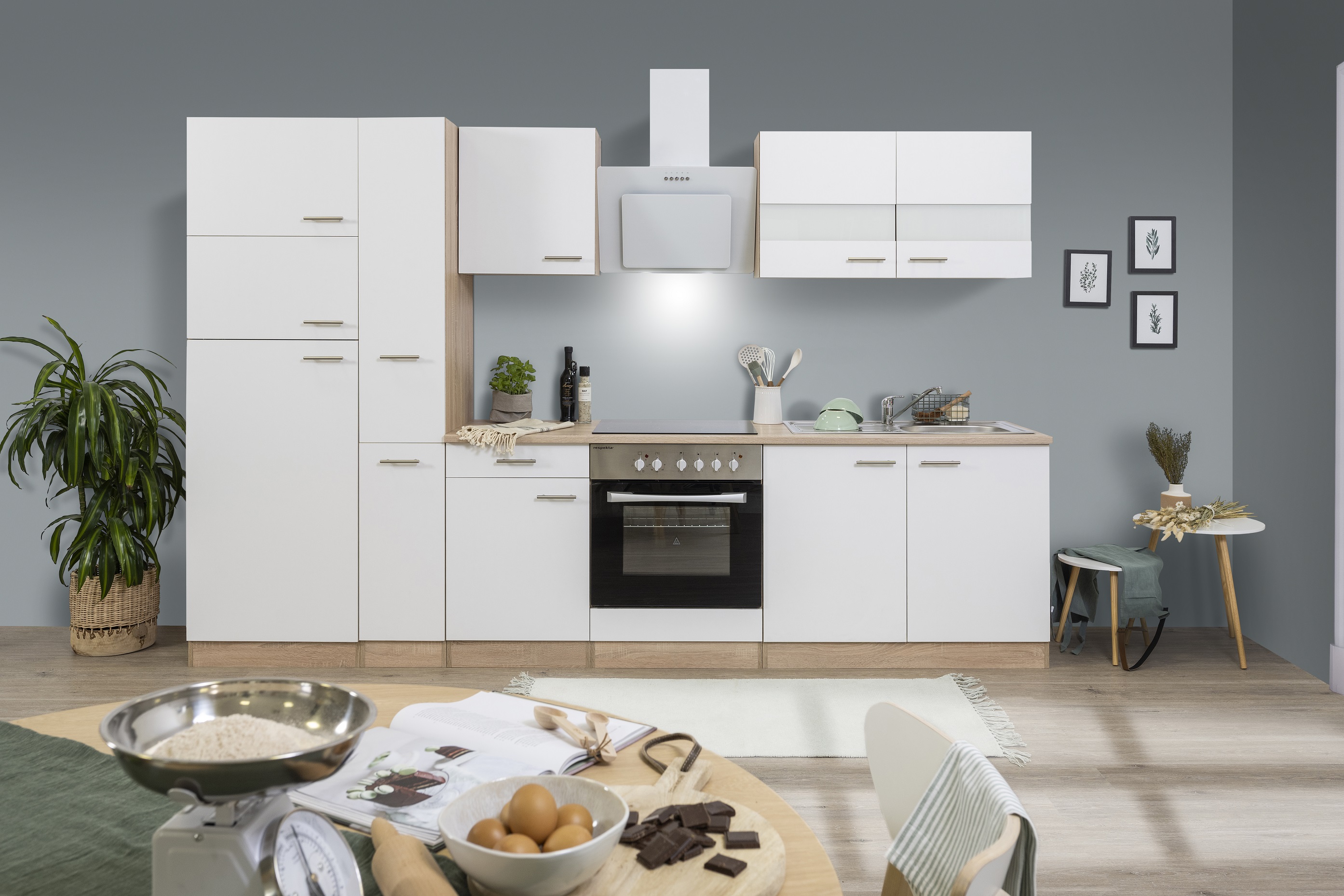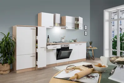 Wow, was für eine Küche! Diese komplette Küchenzeile mit 310cm Breite hat wirklich alles, was du brauchst. In modernem Schiefer Grau mit weißer Arbeitsplatte in Marmor-Optik sieht sie einfach mega-stylisch aus! Und das Beste: Alle Elektrogeräte sind schon dabei! Du kriegst einen Einbaukühlschrank mit 4 Sternen, einen Geschirrspüler, ein Glaskeramik-Kochfeld, einen Backofen und eine Dunstabzugshaube - also wirklich alles aus einer Hand! Die Küche besteht aus hochwertigen Materialien: Fronten aus beschichtetem Schiefer, Korpus in weiß melaminbeschichtet, Arbeitsplatte ebenfalls melaminbeschichtet. Die Metall-Beschläge und Bügelgriffe in Silber geben ihr einen edlen Look. Mit Spülenschrank, Herdumbauschrank, verschiedenen Unter- und Hängeschränken sowie einer praktischen Edelstahl-Spüle mit Abtropffläche ist für genügend Stauraum gesorgt. Die Montage ist zwar selbst zu machen, aber mit der bebilderten Anleitung absolut machbar! Per Spedition geliefert, sicher verpackt. Türanschlag links oder rechts möglich - total flexibel! Mach deine Küche zum Lieblingsraum - diese Komplettküche macht's möglich!