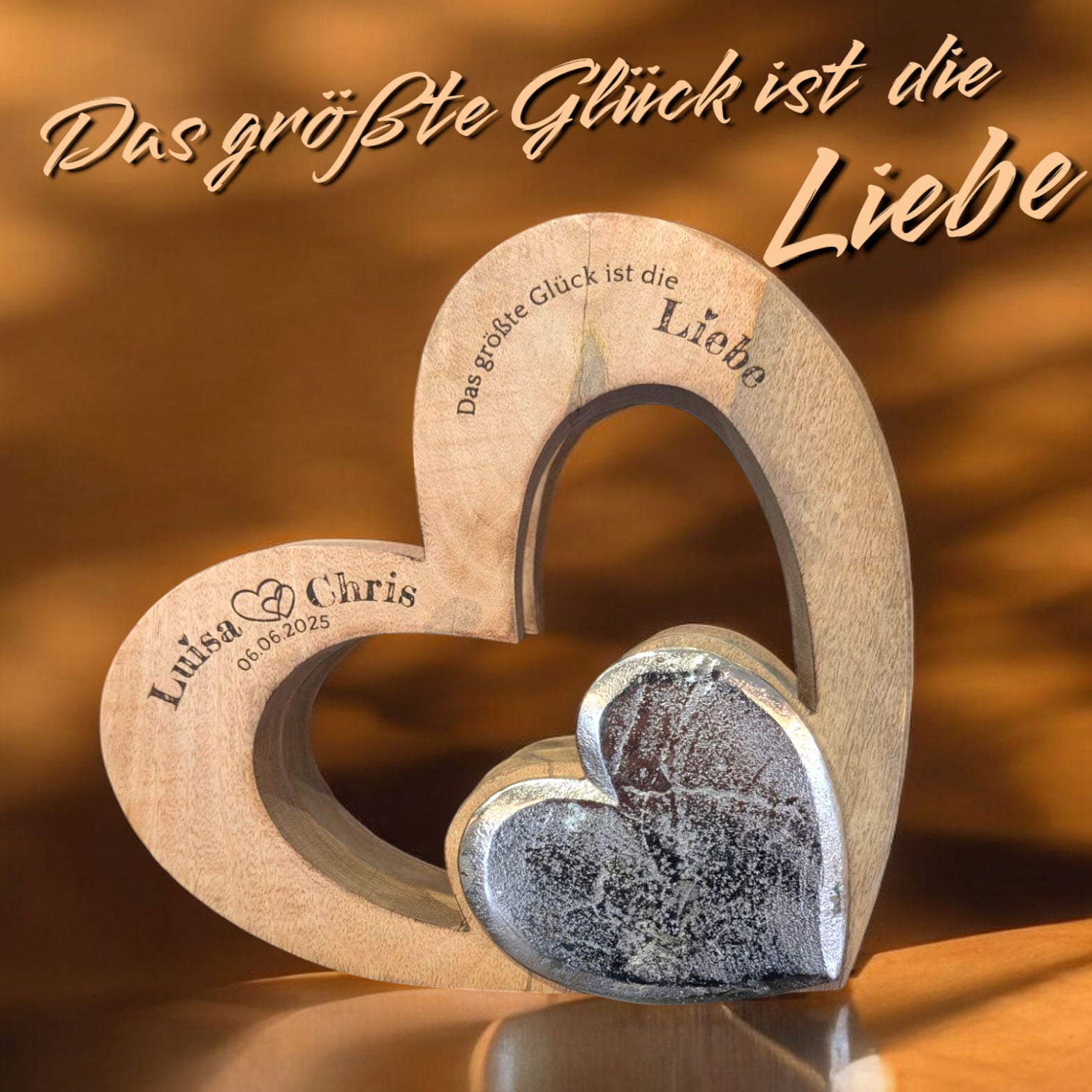 Romantik für Ihr Zuhause! Diese wunderschöne Herz-Skulptur von formano vereint zwei kunstvoll verbundene Herzen aus glänzendem Aluminium mit einem warmen Mango-Holz Sockel. Mit 35cm Breite und 21cm Höhe ein echter Blickfang für Sideboard, Regal oder Fensterbank. Das moderne Design passt zu jedem Einrichtungsstil und symbolisiert Liebe und Verbundenheit. Perfekt als Hochzeitsgeschenk, zum Jahrestag, Valentinstag oder einfach als Liebeserklärung an das eigene Zuhause. Der Kontrast zwischen kühlem Metall und warmem Holz schafft eine besondere Ausstrahlung. Sockelmaße: 24,5x6,5cm. Ein zeitloses Deko-Stück das Herzen höher schlagen lässt - bestellen Sie noch heute und verbreiten Sie Liebe in Ihren vier Wänden!