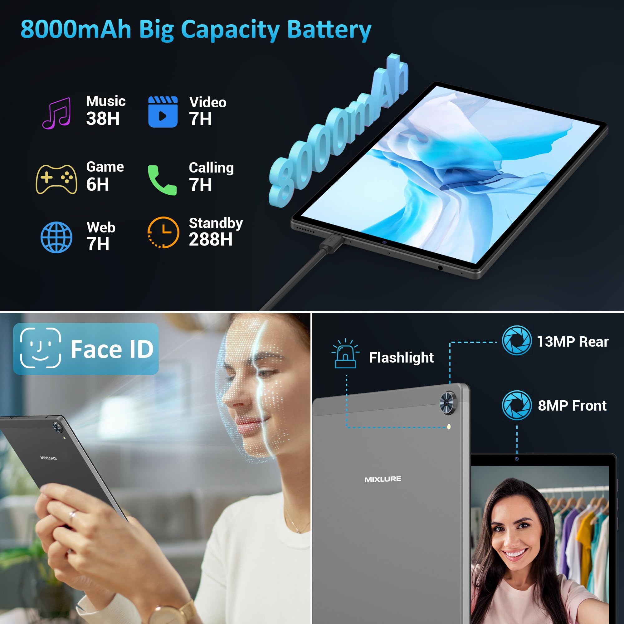 MIXLURE Android 14 Tablet 10 Zoll - 36GB RAM, 128GB ROM, 8000mAh - Komplettset Mit Tastatur & Maus