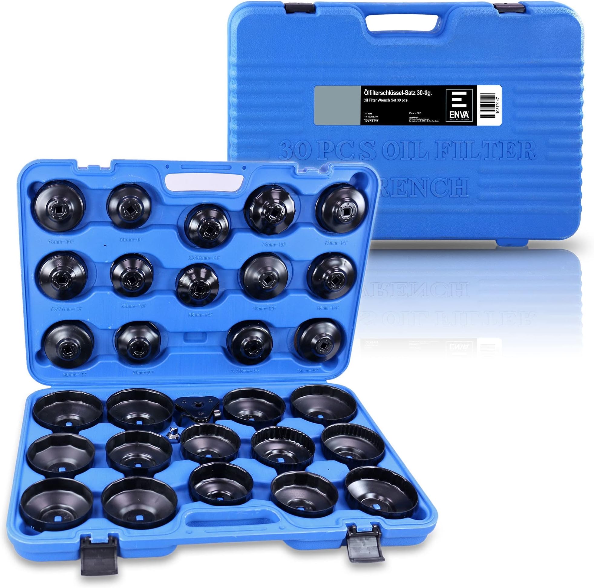 Ölwechsel selbst machen? Mit diesen 3 Ölfilterkappen geht's easy! Das Set enthält 27mm (für Mercedes A-Klasse), 32mm (für Opel Astra/Corsa/Zafira) und 36mm (für BMW, Mercedes, Opel, Ford). Aus Chrom-Vanadium-Stahl mit schwarzer Brünierung - extrem robust. Mit 3/8\ Antrieb passend für die meisten Knarren und Verlängerungen. Macht das Lösen und Festziehen von Ölfilterkartuschen zum Kinderspiel. Ideal für Heimwerker und Werkstätten. Wird im praktischen Kunststoffkoffer (blau oder rot) geliefert - alles ordentlich verstaut. Nie wieder Probleme beim Ölwechsel! Achtung: Kein Spielzeug - von Kindern fernhalten.