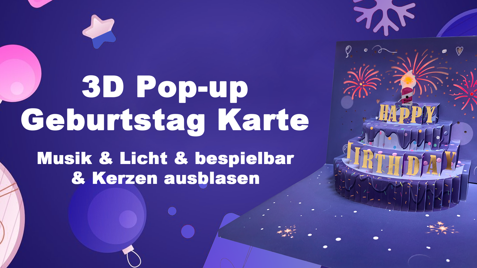 Wow, diese Geburtstagskarte ist der absolute Hit! Wenn man sie öffnet, poppt ein 3D-Kuchen auf, 'Happy Birthday' ertönt und Lichter blinken. Noch cooler: Du kannst die Kerze 'auspusten' und es ertönt Jubel! Und das Beste: Zieh am Schalter und Konfetti explodiert heraus. Hinter dem Kuchen ist noch Platz für persönliche Grüße. Handgefertigt mit Liebe zum Detail - eine echte Überraschung, die jeder Geburtstagsmensch lieben wird. Viel besser als eine langweilige Standardkarte!