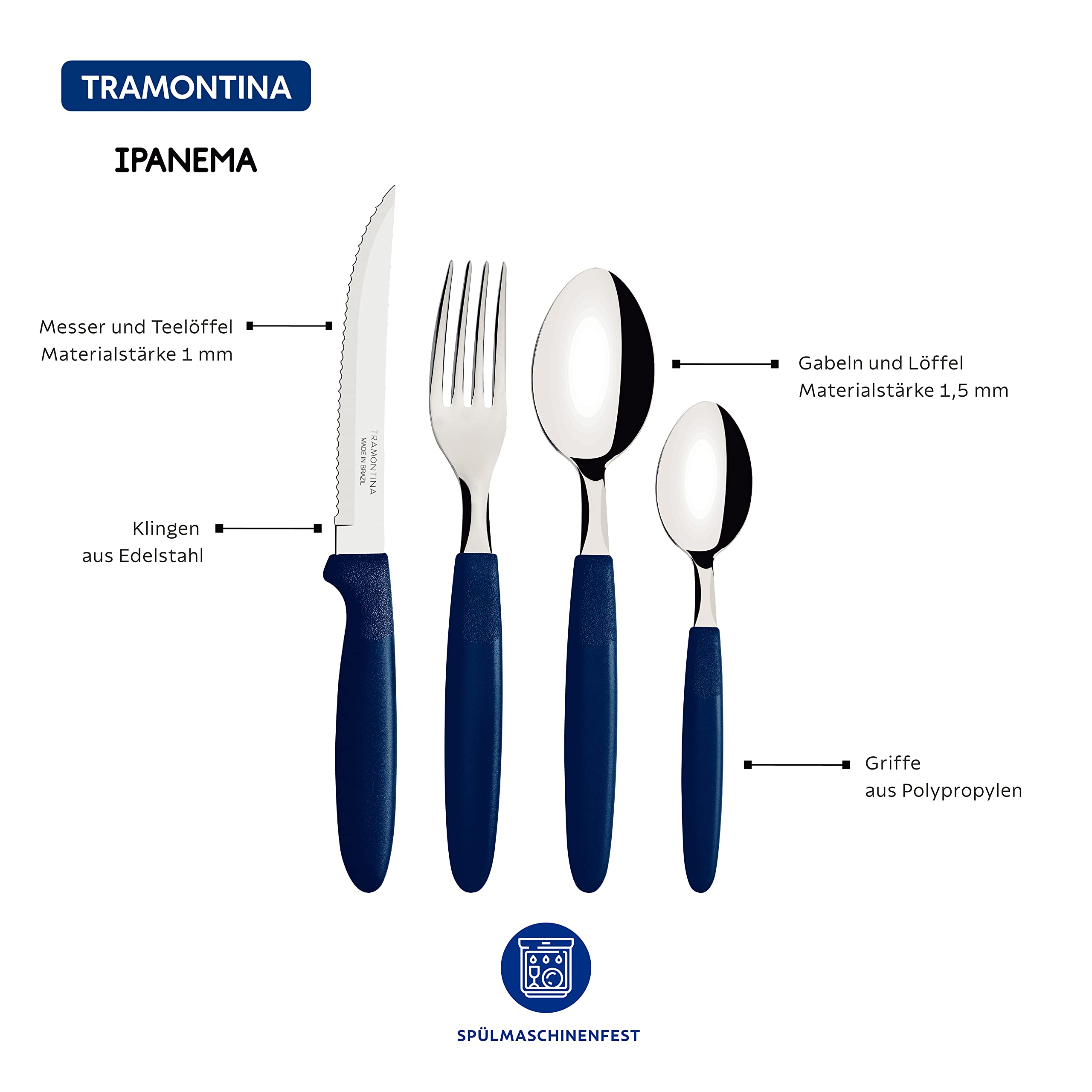 Diese Tramontina Gabeln bringen Farbe auf deinen Tisch! Das 3er Set in schickem Dunkelblau mit Edelstahl-Klingen sieht einfach fresh aus. Die Polypropylen-Griffe sind super robust und spülmaschinenfest - perfekt für den täglichen Gebrauch. Die dickeren Stahlklingen geben extra Stabilität, nichts verbiegt hier so schnell. Ob für Familienessen, Party oder einfach jeden Tag - diese Gabeln machen gute Laune! Tramontina Qualität made in Brazil - da weißt du, was du hast. Einfach auspacken und sofort verwenden. Dein Tisch wird zum echten Hingucker!
