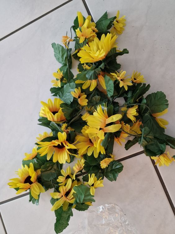 Bring Sommerstimmung in dein Zuhause! Diese 2,3 Meter lange Sonnenblumen-Girlande mit 10 Blütenköpfen sieht täuschend echt aus und benötigt keine Pflege. Jede Blüte hat etwa 10 cm Durchmesser.