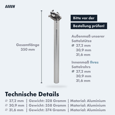 Radfahrer, diese Boenoea Sattelstütze ist die perfekte Lösung für dein Bike! Erhältlich in verschiedenen Durchmessern: 25,4mm, 27,2mm, 28,6mm, 30,4mm, 30,9mm und 31,6mm - also für fast jedes Fahrrad geeignet. Mit 400mm Länge bietet sie genug Spielraum für die optimale Sitzposition. Aus hochwertiger Aluminiumlegierung gefertigt, ist sie leicht, korrosionsbeständig und extrem langlebig. Die Installation ist super einfach: Alte Sattelstütze raus, neue rein - fertig! Wichtig: Achte auf die Sicherheitslinie und schiebe die Stütze nicht zu weit rein. Die Sattelklemme ist nicht im Lieferumfang enthalten, also pass auf, dass du deine alte weiterverwenden kannst. Bevor du bestellst, miss unbedingt den Durchmesser deiner aktuellen Sattelstütze! Ob für Mountainbike, Rennrad oder Citybike - mit dieser Sattelstütze stellst du deine Sitzhöhe genau ein und radelst bequem und ergonomisch. Einfach bestellen, einbauen und losradeln!