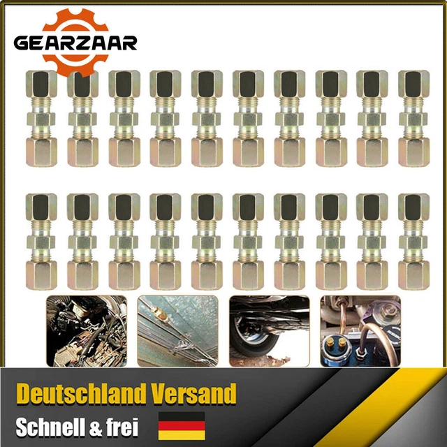 10 Bremsleitungsverbinder im Set - ideal für Bremsreparaturen! Aus Kupfer, Kupfer-Nickel und Stahl, daher super langlebig und hitzebeständig. Durchmesser: 4,75 mm, passen perfekt zu Standard-Bremsleitungen. Ohne Bördeln - die Montage geht ratzfatz und ist auch für Einsteiger geeignet. Die Schneidringverschraubung sorgt für eine sichere, dichte Verbindung, kein Lästern mit undichten Stellen. Mit 10 mm Schlüsselweite leicht anzuziehen. Jedes Paket hat 10 Stück - genug für mehrere Projekte oder zum Aufbewahren für den nächsten Einsatz. Ob am Auto, Motorrad oder Fahrrad - diese Verbinder machen Bremsarbeiten einfacher und sicherer. Einfach installieren und freuen, dass alles dicht bleibt!