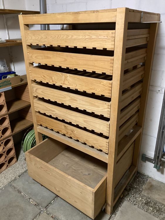Dieses wunderschöne Vorratsregal von dobar bringt Ordnung in deine Küche! Aus FSC-zertifiziertem Kiefernholz gefertigt, ist es nicht nur nachhaltig, sondern auch super stabil. Mit 53x35x116cm passt es perfekt in Vorratskammer oder Küchenecke. Die vier herausnehmbaren Fächer mit Tragegriffen machen das Sortieren zum Kinderspiel. Dein Obst und Gemüse bleibt länger frisch dank der optimalen Luftzirkulation - keine Druckstellen mehr! Ob Äpfel, Kartoffeln, Tomaten oder Zwiebeln - alles hat seinen Platz. Das Regal wiegt nur 13,5kg, also leicht zu verschieben wenn mal umgeräumt wird. Das naturbelassene Holz passt zu jedem Einrichtungsstil und wird mit der Zeit noch charmanter. Perfekt für alle, die ihre Ernte aus dem Garten lagern oder einfach nur Ordnung im Vorratsschrank lieben. Ein Möbelstück, das nicht nur praktisch ist, sondern auch richtig gut aussieht!