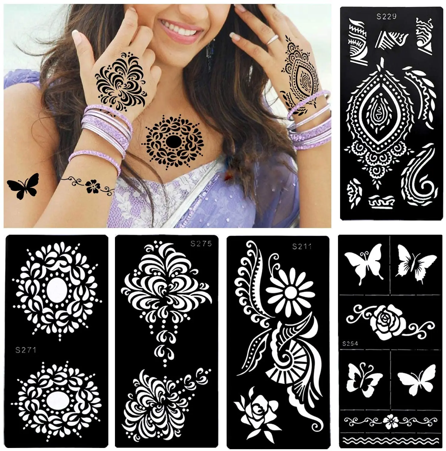 4 Große Tattoo Schablonen Blätter - Mandala, Feder, Elefant & Schmetterling Für Henna Bodypainting