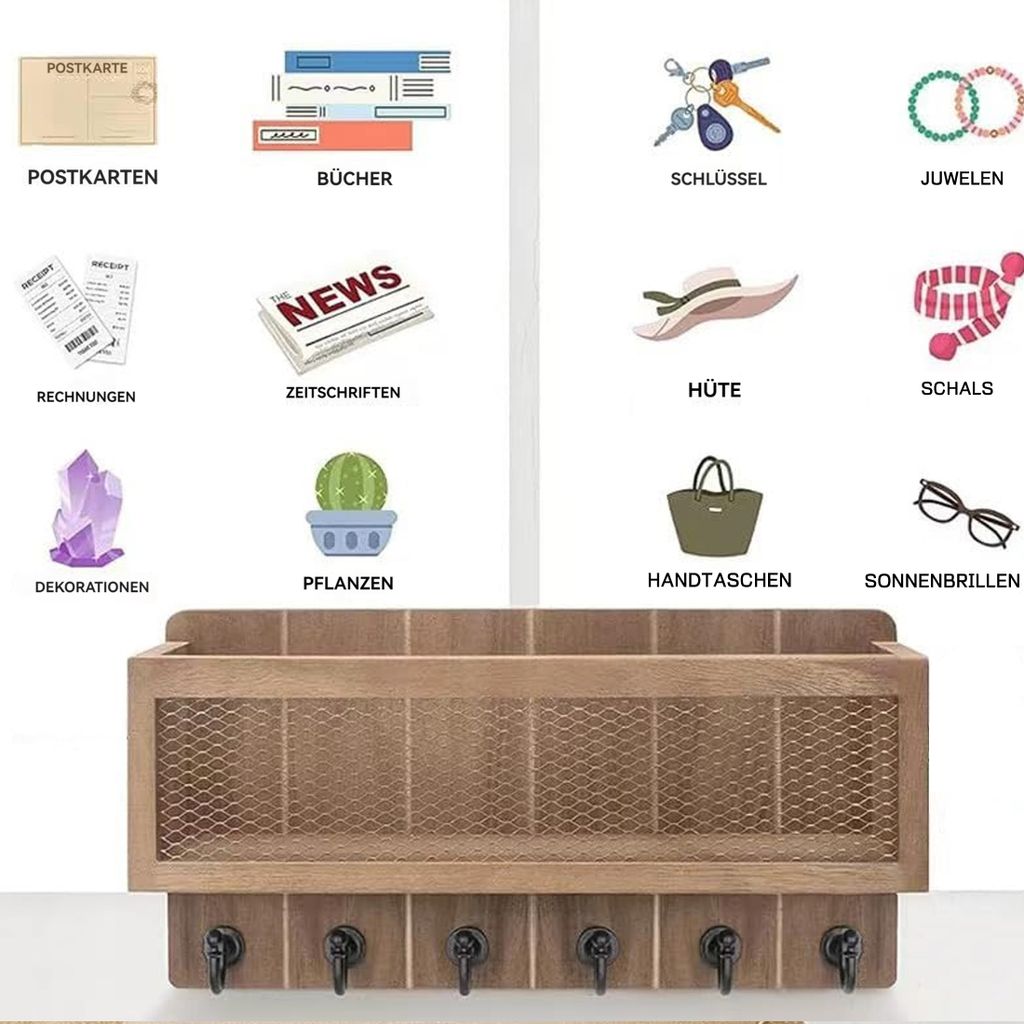 Endlich Ordnung im Flur! Dieses Schlüsselbrett aus Holz ist nicht nur super praktisch, sondern sieht auch noch richtig gut aus. Mit vier fest integrierten Haken hast du immer einen Platz für deine Schlüssel, Schlüsselanhänger oder andere kleine Dinge. Die obere Ablagefläche eignet sich perfekt für Briefe, dein Handy, die Sonnenbrille oder ein paar Deko-Stücke. Alles ist aus massivem Holz gefertigt und überzeugt durch eine hochwertige Verarbeitung. Der dunkle Rahmen und die hellen Innenwände sorgen für einen modernen Look, der in jede Einrichtung passt. Montiert wird das Brett platzsparend an der Wand – ideal auch für kleine Flure oder Apartments. Nie wieder suchen, immer alles griffbereit. Ein schönes Geschenk für alle, die Wert auf Ordnung und Stil legen. Mach deinen Eingangsbereich aufgeräumt und gemütlich – mit diesem Schlüsselbrett!