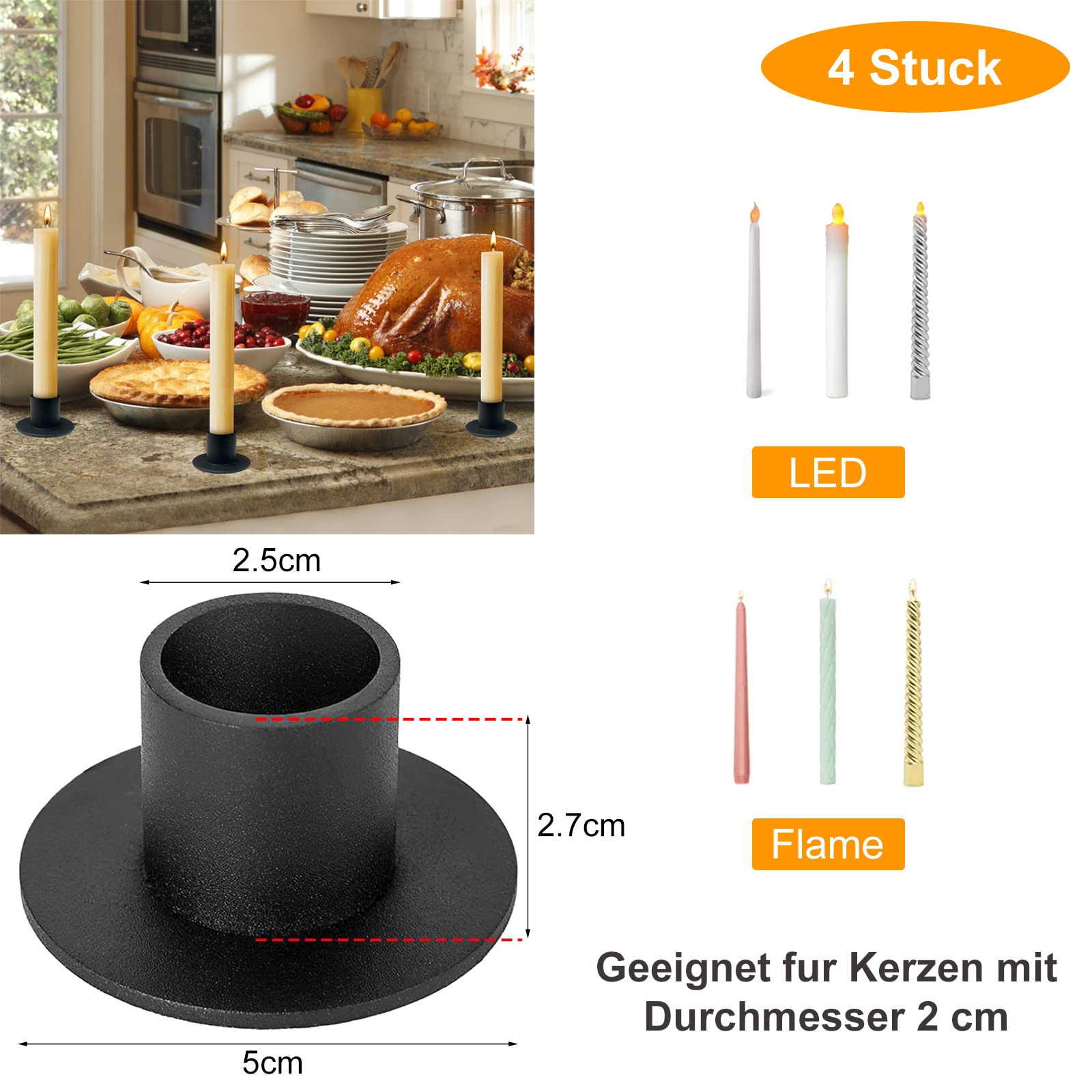 Oh, diese schwarzen Kerzenständer sind ja mal total niedlich! Im 4er-Set bekommst du richtig viel Deko für deinen Tisch. Aus hochwertigem Schmiedeeisen gefertigt, sind sie robust und langlebig. Die galvanisierte Oberfläche rostet nicht und ist korrosionsbeständig - also wirklich qualitativ hochwertig! Mit 5x4x2,8 cm Maßen sind sie kompakt aber wirkungsvoll. Der Innendurchmesser von 2,1 cm passt perfekt für die meisten Standardkerzen. Die Installation ist super einfach - einfach die Kerze in das Loch des Halters stecken, fertig! Das einfache Retro-Design passt zu so vielen Anlässen: Romantische Candle-Light-Dinner, Hochzeiten, Jahrestage, Weihnachten, Valentinstag, Geburtstage oder einfach als Deko für dein Zuhause im Bauernhaus-Stil. Die solide Metallbasis hält deine Kerzen stabil und verhindert das Umfallen. Die matte schwarze Oberfläche sieht elegant und zeitlos aus. Einfach aber wirkungsvoll - genau das richtige für gemütliche Abende und besondere Anlässe! Macht jedes Essen zum besonderen Erlebnis!