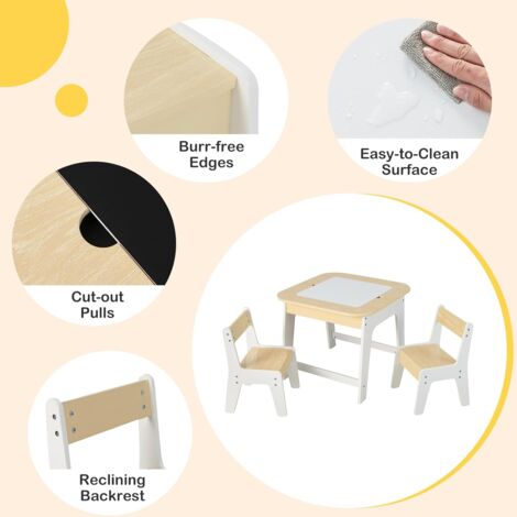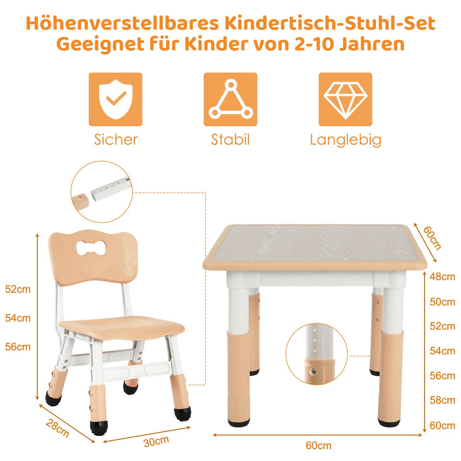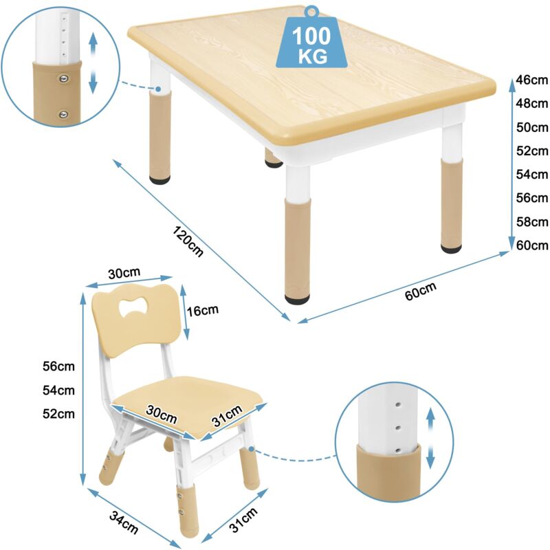 Boah, dieses Kinderzimmer-Set ist ja mal richtig praktisch! Ein Tisch und vier Stühle, die MIT deinem Kind mitwachsen - von 2 bis 10 Jahren! Der Tisch hat ganze 7 Höheneinstellungen (46-60 cm) und die Stühle 3 (52-56 cm). Aus sicherem HDPE- und ABS-Kunststoff, komplett geruchlos und unbedenklich für die Kleinen. Die Tischplatte ist 120x60 cm groß - da haben Malbücher, Bausteine und das Pausenbrot richtig Platz! Und die rutschfesten Gummifüße sorgen dafür, dass nichts verrutscht. Besonders clever: Die Tischoberfläche ist blendfrei und schont so die Kinderaugen. Ob für Hausaufgaben, Mittagessen oder kreative Basteleien - dieses Set ist der absolute Allrounder! Einfach aufbauen (geht wirklich leicht) und jahrelang Freude daran haben. Die holzfarbene Optik sieht dabei auch noch total schick aus!