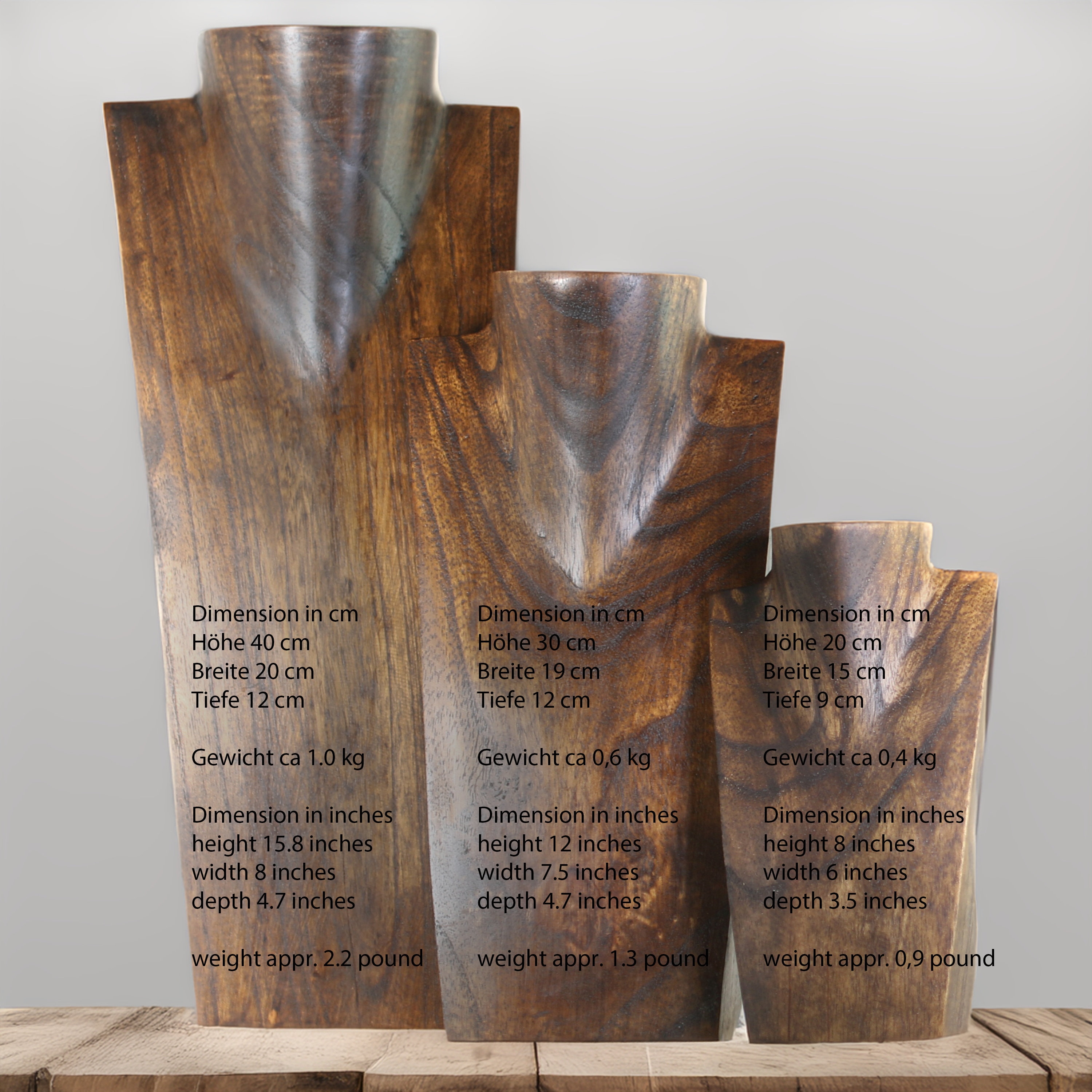 Suchst du eine stylische Möglichkeit, deine Schmuckstücke perfekt in Szene zu setzen? Dieser handgefertigte Schmuckständer aus Naturholz ist genau das Richtige! Mit stolzen 40 cm Höhe bietet er genug Platz für Ketten bis 80 cm Länge. Jede Büste ist ein Unikat - die natürliche Maserung des Holzes gibt jedem Stück seinen eigenen Charakter. Perfekt für dein Zuhause, den Laden oder Messen! Die polierte Oberfläche schützt deine wertvollen Stücke vor Kratzern und sorgt dafür, dass nichts verheddert. Einfach mit einem trockenen Tuch abwischen und schon glänzt sie wieder wie neu. Umweltbewusst und nachhaltig - weil gutes Design auch Verantwortung bedeutet. Ob als praktischer Helfer im Alltag oder als eyecatcher im Schaufenster - dieser Ständer macht einfach überall eine gute Figur! Und als Geschenk für Schmuckliebhaber ist er natürlich auch ein Volltreffer. Hol dir jetzt diese zeitlose Schönheit und präsentiere deine Schätze, wie sie es verdienen!
