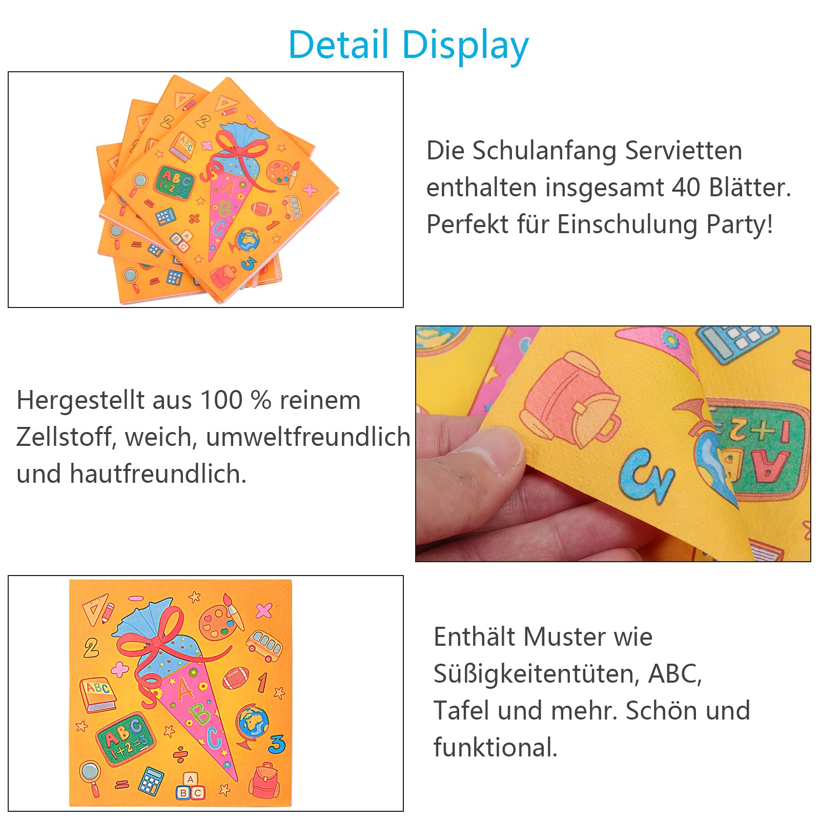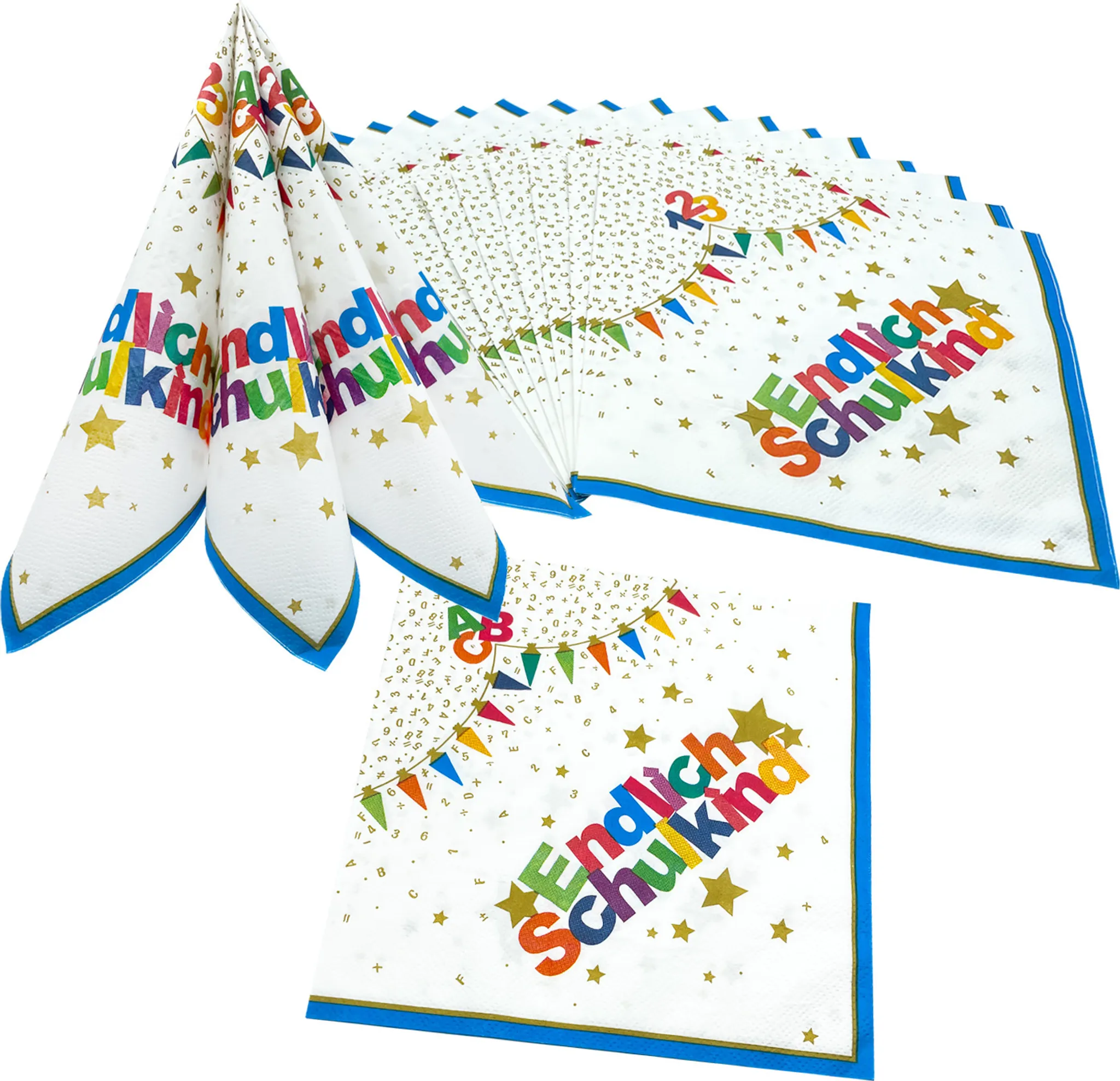 Die perfekte Deko für die Einschulungsparty! Diese 40 Servietten mit süßem 'Endlich Schulkind'-Aufdruck machen jede Feier bunter! Mit fröhlichen Motiven wie Bonbontüten, 1+1=2 und ABCs - einfach niedlich! Aus 2-lagigem, hochwertigem Papier - saugstark und reißfest! Jede Serviette 33x33cm groß - genug Platz für kleckernde Kinderhände! In lebensmittelechten, ungiftigen Farben gedruckt - absolut sicher für Kinder! Perfekt für die Frühstücksbox, die Schultüte oder als Tischdeko bei der Einschulungsfeier! Macht sich super auf dem Geburtstagstisch oder in der Lunchbox! Einfach auspacken und dekorieren - so einfach war Schulanfangs-Deko noch nie! Überrasche dein Schulkind mit dieser fröhlichen Deko - die Freude ist garantiert! Perfekt für Jungen und Mädchen - das Design gefällt allen!