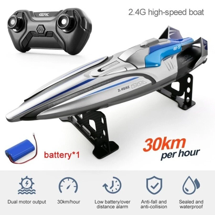 Ab aufs Wasser mit diesem coolen RC-Boot! Das OBEST ferngesteuerte Boot bringt Action in jeden Pool, See oder Teich. Mit der 2.4GHz Fernsteuerung hast du eine Reichweite von bis zu 50 Metern - und selbst wenn mehrere Boote gleichzeitig fahren, gibt's keine Störungen. Das doppelte Paddel-Design sorgt für starken Antrieb und hohe Geschwindigkeit. Besonders cool: Die eingebauten LED-Lichter machen das Boot nachts zum echten Hingucker! Aus transparenter ABS-Kunststoffschale gefertigt, die die Lichteffekte perfekt zur Geltung bringt. Mit zwei 3,7V 1000mAh Akkus hast du bis zu 60 Minuten Spielspaß - und das niedrige Batteriewarnsystem warnt dich rechtzeitig. Das stromlinienförmige Design reduziert Wasserwiderstand für stabile Fahrten. Perfekt für Kinder und Erwachsene - aber Achtung: Nicht für Kinder unter 3 Jahren und immer unter Aufsicht benutzen! Das ideale Geschenk für Geburtstage, Weihnachten oder einfach so.