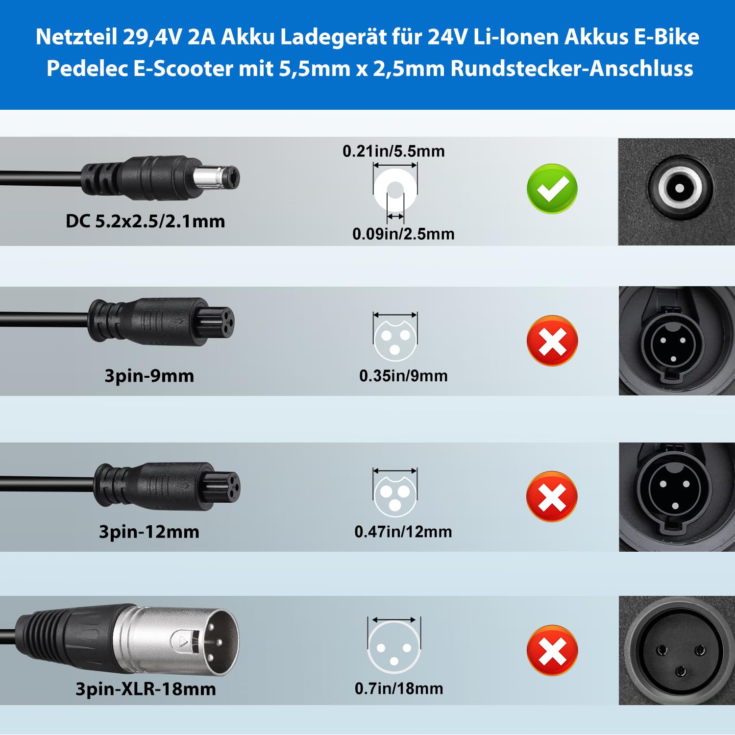Xietongpo 29,4V 2A Ladegerät Für 24V E-Scooter & Hoverboards - 5 Anschlüsse Inklusive