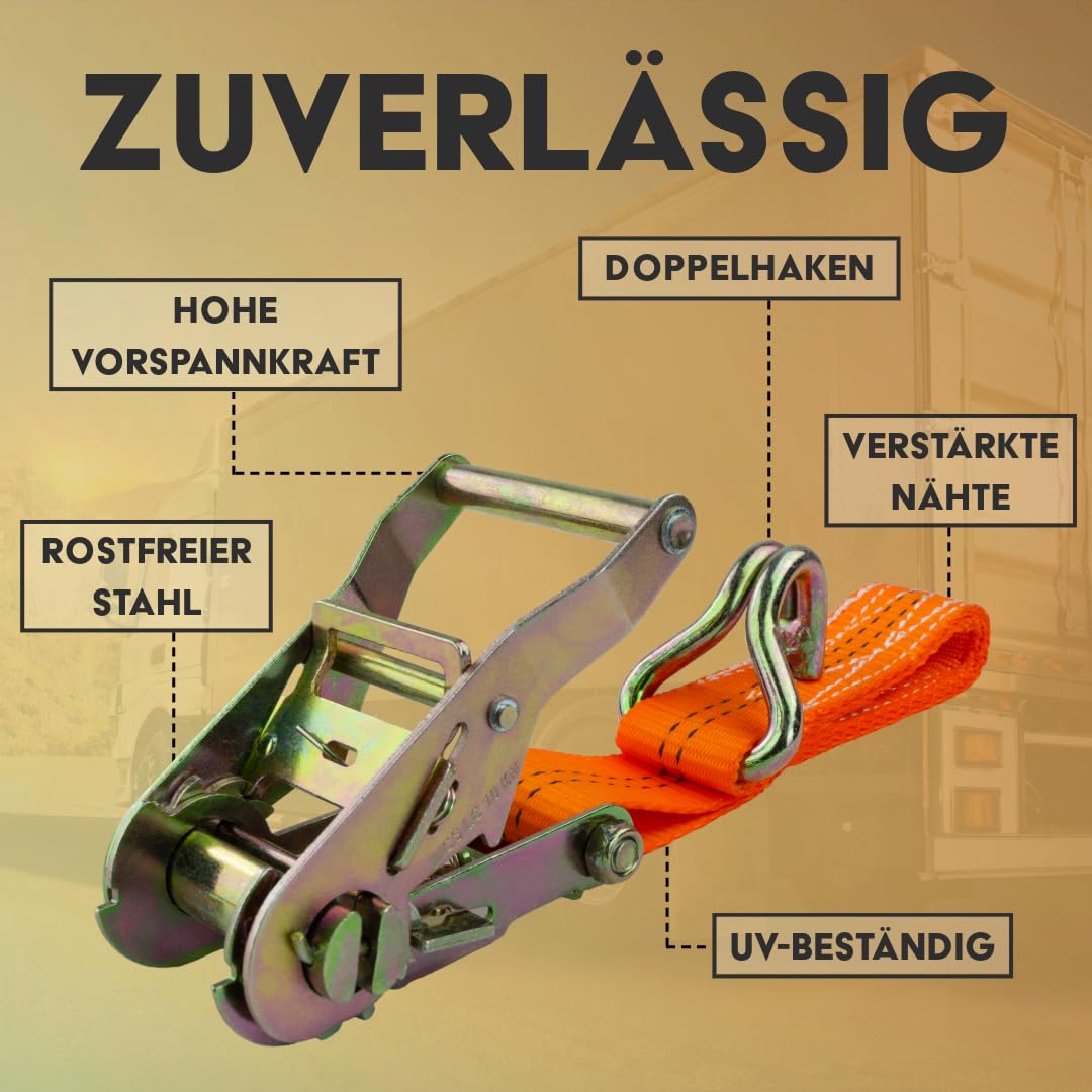 Jeder Gurt ist 6 Meter lang bei 35mm Breite und hält bis zu 2000kg Mindestbruchkraft (1000kg Zurkraft). Mit praktischer Ratsche für einfaches und straffes Verspannen.
