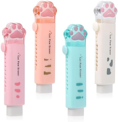 Wie süß sind denn diese Katzenpfoten-Radiergummis! Perfekt für Schule, Büro oder zum Zeichnen. Jeder Radierer ist 9.2cm lang - passt super in jedes Federmäppchen. Das einziehbare Design ist genial - einfach Knopf drücken und radieren! Macht sauber ohne das Papier zu beschädigen. Die vier Farben rosa, weiß, grün und orange sind richtig knallig. Riechen sogar leicht fruchtig - aber nicht aufdringlich. Meine Tochter nimmt sie überall mit und ihre Freundinnen sind total neidisch! Auch für Erwachsene super - macht Spaß damit zu arbeiten. Qualitativ hochwertig, nichts bricht ab. Großes Paket mit 4 Stück - kann man auch verschenken. Absoluter Hingucker auf dem Schreibtisch!