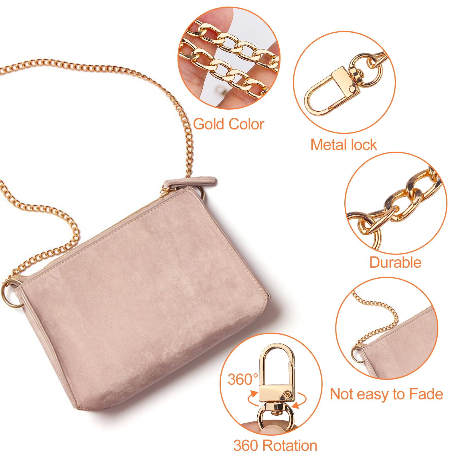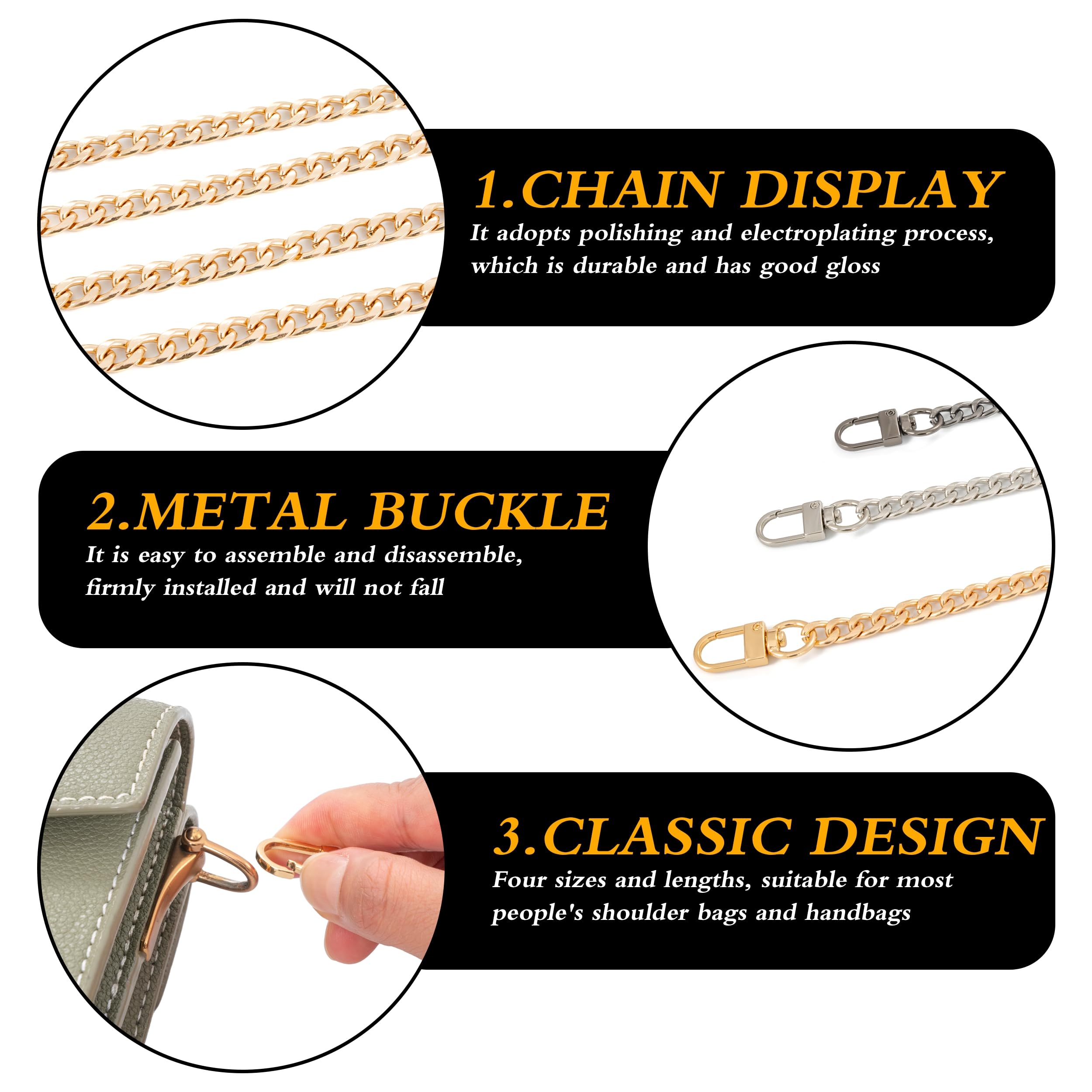 Hey, peppe deine Lieblingstasche auf! Dieses Set mit 4 goldenen Taschenketten in verschiedenen Längen (30, 60, 100, 120 cm) gibt dir totale Flexibilität. Aus robustem Eisenmetall gefertigt, verblasst die Farbe nicht so schnell. Die flachen Glieder liegen super angenehm auf der Schulter - kein Drücken mehr! An beiden Enden Sicherheitsschnallen, die sich um 360° drehen lassen. Einfach einhaken und schon hast du einen komplett neuen Look. Perfekt für Schultertaschen, Handtaschen, Crossbody-Bags oder Rucksäcke. Die 120 cm Kette ist ideal für den Crossbody-Style, die 30 cm für den Handgelenk-Look. Mach aus deiner alten Tasche was ganz Besonderes - ohne teure Neuanschaffung! Einfach die alte Kette abnehmen, neue dran - und schon strahlt deine Tasche wie neu!