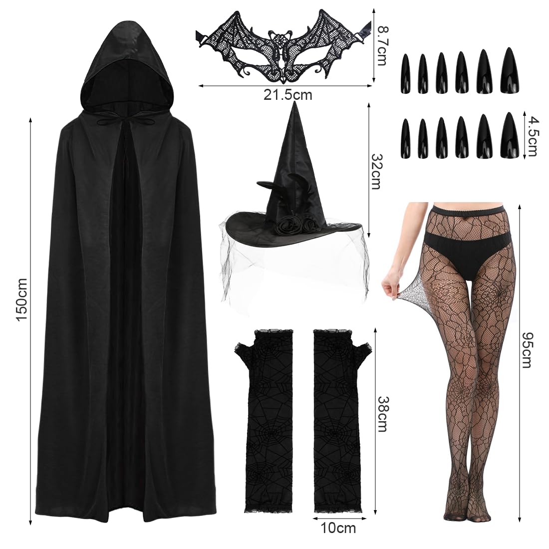 Verwandle dich in eine mystische Hexe! Dieses 5-teilige Set hat alles, was du für Halloween oder Karneval brauchst: faltbarer Hexenhut (38x35cm), eleganter Samtumhang (180cm lang), lange Hexenhandschuhe, Spinnenmaske und Spinnenkette. Der Umhang aus glattem Satin fühlt sich super weich an und wirft dich richtig in die Hexenrolle. Der Hut mit Spinnen-Applikation ist der absolute Hingucker. Perfekt für Mottopartys, Karnevalsumzüge oder gruselige Halloween-Abende. Einfach anziehen und die Magie beginnt! Mit diesem Set wirst du definitiv zum Blickfang auf jeder Party. Doppeltes Festvergnügen garantiert!