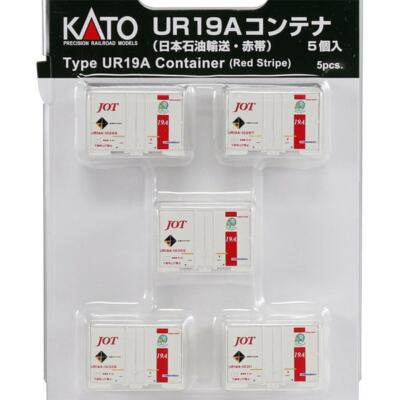 Hey Modellbahn-Fans! Dieses superdetaillierte Kato Container-Set bringt japanischen Güterverkehr in euren N Gauge Bahnhof. Die 5 Container im UR19A-Design mit den charakteristischen roten Streifen sind originalgetreu nachgebildet - genau wie die echten Kühlcontainer von Nippon Oil Transport. Perfekt für alle, die ihre Güterzüge authentisch beladen wollen! \\n\\nMaßstab: 1:160 (passt auch zu 1:148 UK-Modellen) \\nEnthalten: 5 Container mit unterschiedlichen Markierungen \\nBesonderheiten: Eco-Rail-Zeichen, realistische Größe, kompatibel mit Containerwagen 50000 und anderen JR Freight Modellen \\n\\nDie Container sind übrigens kein Spielzeug, sondern richtige Modellbau-Artikel für erwachsene Sammler. Mit den verschiedenen Lackierungen - von der alten rötlich-violetten Version bis zur neuen schlichten Variante - könnt ihr ganze Zugkompositionen zusammenstellen. Die Container lassen sich beliebig kombinieren und sorgen für total realistischen Betrieb auf eurer Anlage! Die Oberflächen sind mega detailliert, inklusive der Seifenblasen-Illustrationen und der typischen JRF-Logos. Einfach auspacken und sofort loslegen - eure Güterzüge werden damit zum absoluten Hingucker!