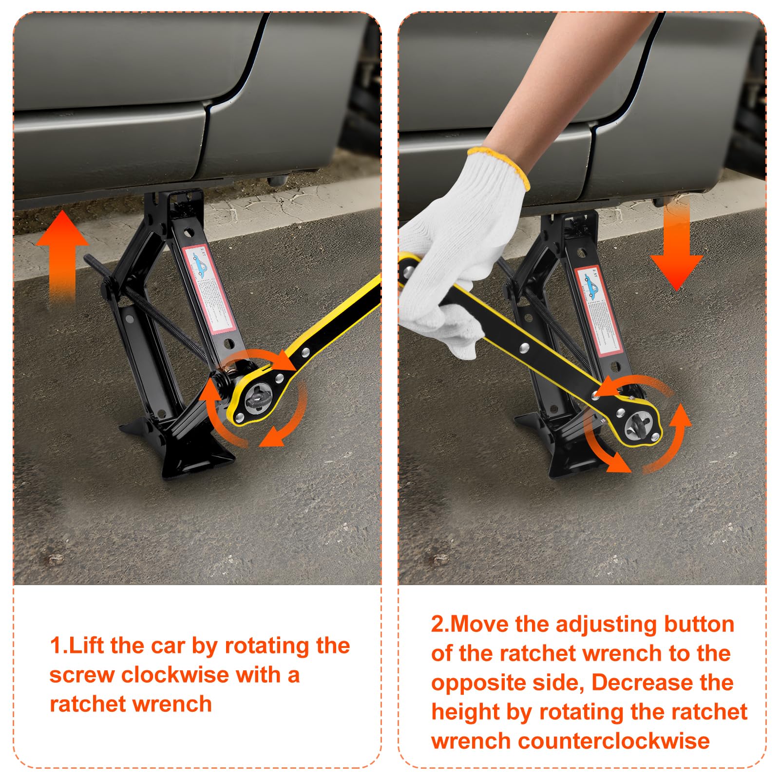 So geht's: Erst die Hebeschraube so weit drehen, bis sie den Unterboden berührt. Dann mit dem Ratschenschlüssel im Uhrzeigersinn drehen bis das Auto hoch genug ist. Reifen wechseln, Wartung machen - was auch immer ansteht. Zum Absenken einfach den Knopf am Ratschenschlüssel umstellen und gegen den Uhrzeigersinn drehen.