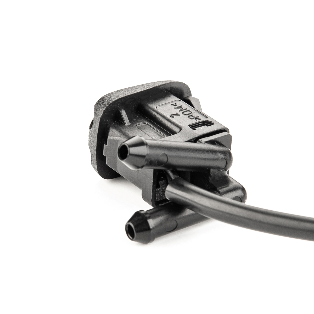 Die Düse wird an der Motorhaube montiert, links oder rechts - je nachdem, wo sie bei deinem BMW hingehört. Sie hat 2-Pin-Anschluss und ein ovales Steckergehäuse. Das Material ist POM (Polyoxymethylen), also robust und langlebig.