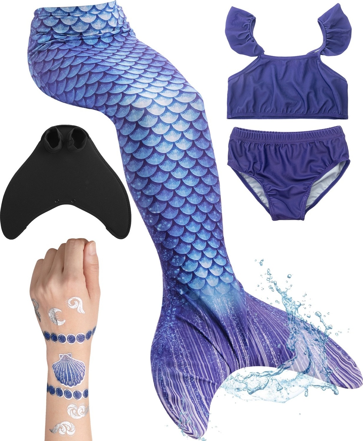 Mermaid Vibes pur! Deine Kleine wird sich fühlen wie Arielle mit diesem niedlichen Meerjungfrau-Badeanzug-Set. Komplett mit Oberteil, Unterwäsche, Schwanzflosse, Monoflosse und Schmuck - alles dabei!\n\nEs gibt fünf Größen von 110 bis 150, also für fast jedes Alter was Passendes. Der Stoff ist dehnbar und haut freundlich, und an der Seite ist ein Reißverschluss, damit die Flosse easy angezogen werden kann.\n\n• Set-Inhalt: Oberteil + Unterwäsche + Schwanzflosse + Monoflosse + Schmuck-Set\n• Größen: 110/120/130/140/150\n• Material: Dehnbar, elastisch, farbecht\n• Pflege: Maschinenwäsche bei niedriger Temperatur\n• Anlässe: Strand, Pool, Mottopartys\n\nStell dir vor, wie ihre Augen leuchten, wenn sie das Set auspackt! Perfekt für den nächsten Strandurlaub, die Poolparty oder einfach nur zum Verkleiden daheim. Der Stoff ist atmungsaktiv und beweglich - sie kann also planschen, ohne dass es kneift oder zwickt. Einfach ein Traumgeschenk für kleine (und große) Meerjungfrauen-Fans!