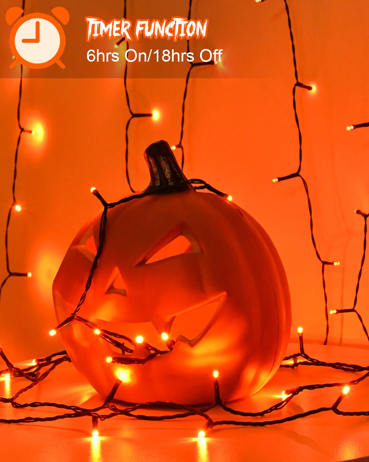 Perfekte Halloween-Stimmung mit dieser bunten Lichterkette! 5 Meter lang mit 50 LEDs in den typischen Halloween-Farben Orange, Lila und Grün. IP65 wasserdicht - hält auch bei Regen problemlos stand!\\n\\nMit praktischem Timer: 6 Stunden an, 18 Stunden aus - wiederholt sich automatisch jeden Tag. Spart Batterien und du musst nicht dran denken! Batteriebetrieben (3x AA, nicht im Lieferumfang) - super flexibel überall aufstellbar!\\n\\nPerfekt für Garten, Veranda, Kamin oder Zimmerdekoration. Die flexiblen Drähte lassen sich in jede Form biegen - ideal für Grusel-Deko! Mit Haken zum einfachen Aufhängen inklusive.\\n\\nNiedrige Spannung - wird nicht heiß, sicher für Kinder und Haustiere! 2 Stück im Set - genug für große Dekorations-Projekte! Macht jede Halloween-Party zum unvergesslichen Erlebnis!