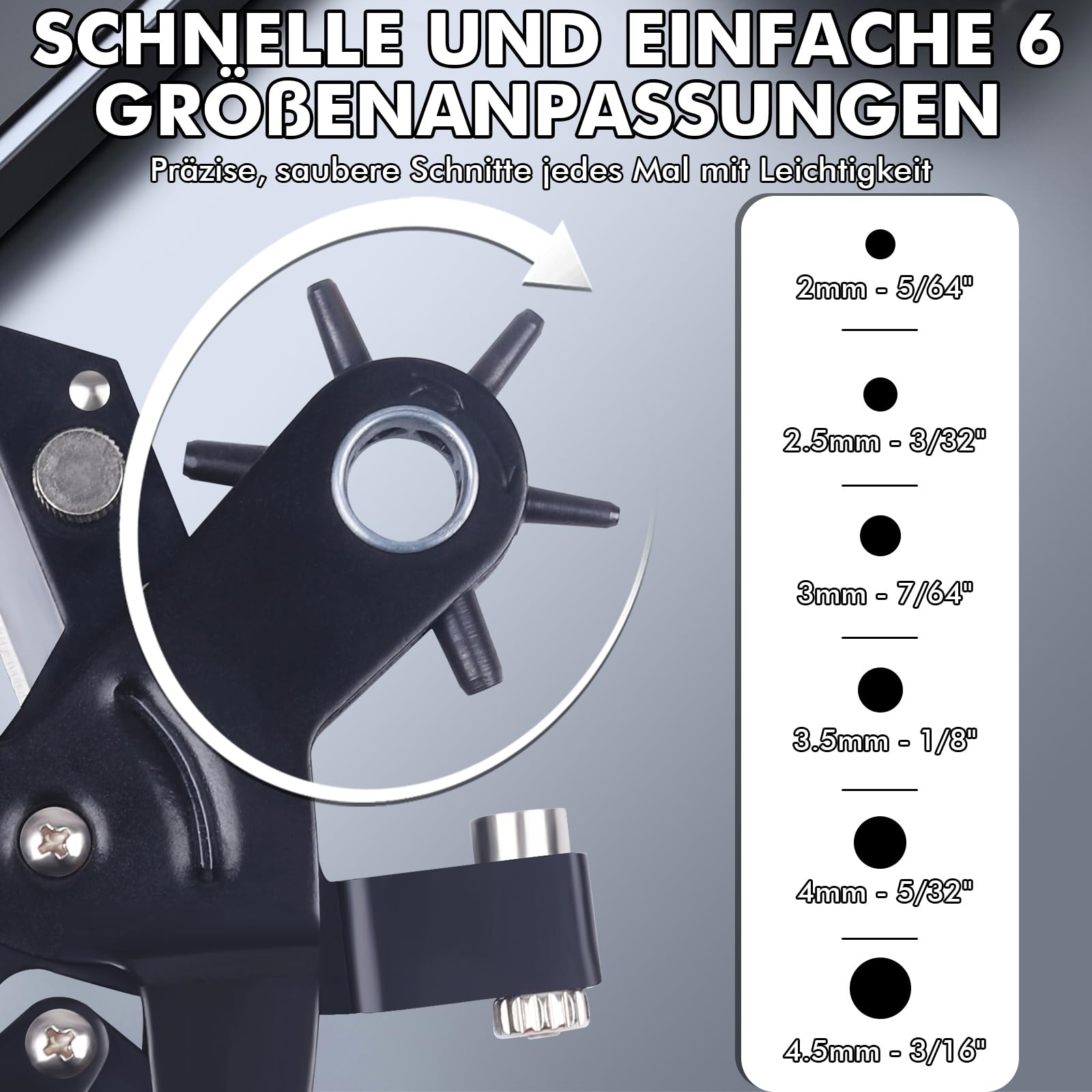 Hey ihr Bastler und Heimwerker! Diese Lochzange ist ein absolutes Multitalent. Mit dabei sind 6 verschiedene Locheisen in den Größen 2,0 / 2,5 / 3,0 / 3,5 / 4,0 / 4,5 mm - also für jedes Projekt die passende Lochgröße! Das Revolver-System ist super praktisch: Einfach drehen und schon ist die nächste Größe aktiv. Aus robustem Manganstahl gefertigt, verchromt gegen Rost und mit ergonomischen Gummi-Griffen die richtig gut in der Hand liegen. Das Doppelhebel-Prinzip macht das Lochen super einfach - keine Kraftakte nötig! Perfekt für Leder, Gürtel, Stoff, Uhrenarmbänder, Hundehalsbänder oder sogar Pappe. Ob neue Löcher im Gürtel, Bastelprojekte oder Reparaturen - damit geht's wie von selbst. Die Löcher werden sauber und präzise. Ein Muss für jede Werkstatt!