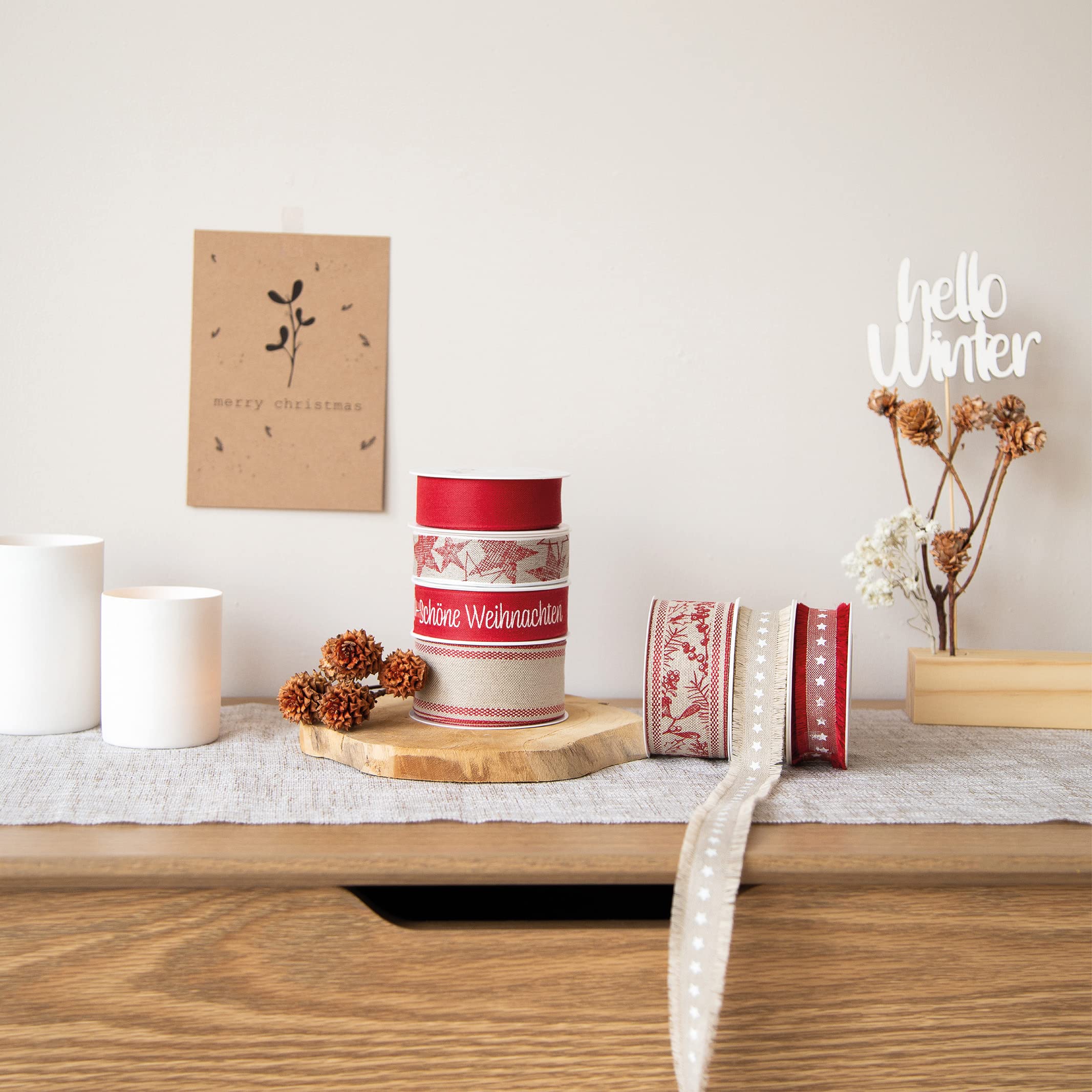 Familiäre Weihnachtstradition seit 1933! Dieses wunderschöne Weihnachtsband-Set von Halbach bringt festliche Stimmung in dein Zuhause. 6 harmonisch abgestimmte Rollen mit liebevollen Sternen-Motiven. 4 Rollen 7mm x 6m und 2 Rollen 15mm x 4m - perfekt für Geschenke, Weihnachtsbaum-Schleifen oder Dekoration. 100% Made in Germany - beste Qualität aus dem Familienunternehmen. Die Bänder sind aus hochwertigem Material und sehen einfach toll aus! Mach deine Weihnachtsgeschenke dieses Jahr besonders festlich - mit diesen edlen Bändern werden sie zum echten Hingucker. Ob für unter den Baum oder als Deko - weihnachtlicher geht's kaum! Hol dir den Zauber der Weihnacht ins Haus - mit deutschen Qualitätsbändern!