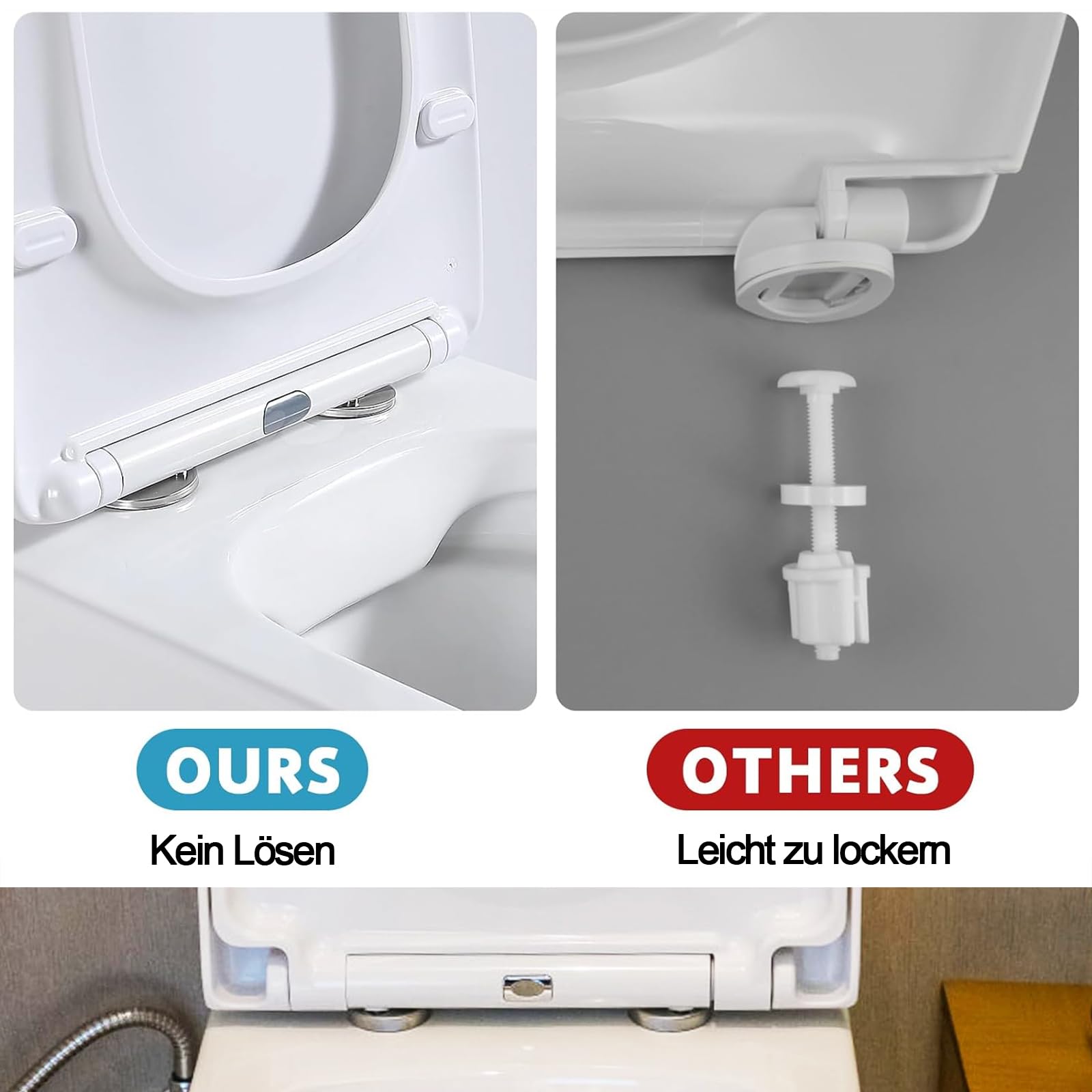 Kein lästiges Wackeln mehr! Diese Befestigungslösung ist die Rettung für jeden lockeren Toilettensitz. Die Gummielemente dichten zusätzlich ab und verhindern unschöne Gerüche.