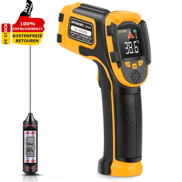 Boah, diese Infrarot-Temperaturpistole ist echt praktisch! Misst berührungslos von -50°C bis 600°C (oder -58°F bis 1112°F). Super genau mit ±1,5°C Abweichung. Das 12:1 Entfernungsverhältnis bedeutet: du kannst aus 12 Meter Entfernung noch auf 1 Meter genau messen! Der große LCD-Bildschirm ist hintergrundbeleuchtet - siehst du also auch im Dunkeln was. Einfach Auslöser drücken, aufs Objekt zielen, und sofort hast du den Wert. Mit Daten-Halte-Funktion, Umschaltung zwischen °C/°F, und nem Emissionsgrad der von 0,1 bis 1,0 einstellbar ist. Perfekt für so viele Bereiche: in der Küche beim Kochen/Backen/Grillen, in der Werkstatt für Auto-Motor-Temperaturen, für HLK-Anlagen, in der Industrie... Wichtig: ist nicht für Menschen oder Tiere geeignet! Misst nur Oberflächentemperaturen von Objekten. Läuft mit 2 AAA-Batterien (nicht dabei). Automatic-Abschaltung nach 12 Sekunden spart Strom. Also, wenn du ne zuverlässige Temperaturpistole für Werkstatt, Küche oder Hobby brauchst - hier bist du richtig. Einfach in die Hand nehmen, messen, und du weißt sofort Bescheid!