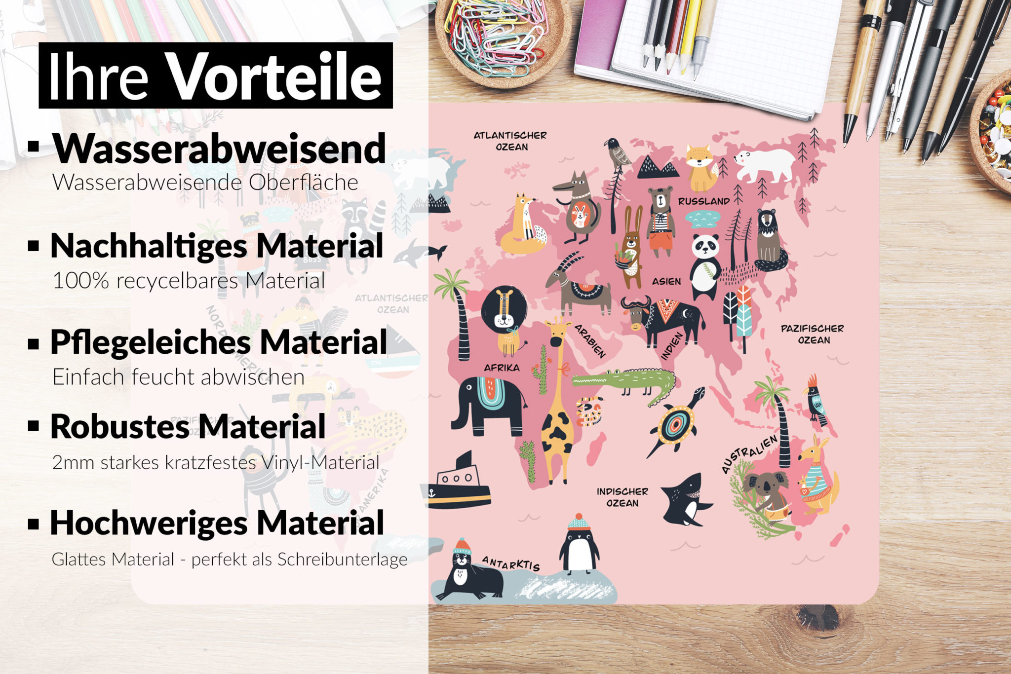 Diese coole Weltraum-Schreibtischunterlage macht Kindern richtig Lust aufs Lernen! Mit 60x40cm Größe passt sie perfekt auf jeden Kinderschreibtisch und schützt vor Kratzern und Flecken. Aus 1,6mm starkem Vinyl ist sie total robust und einfach mit einem feuchten Tuch abwischbar. Das Beste: Sie ist vollgepackt mit Lerninhalten - ABC, Zahlen bis 100, 1x1, Uhrzeiten, geometrische Formen und vieles mehr. So lernen Kinder spielerisch die Basics für die Schule. Die abgerundeten Ecken sind sicher und die rutschfeste Unterseite hält alles an Ort und Stelle. Perfekt zur Einschulung oder als Geschenk für Vorschulkinder. Einfach ausrollen und loslegen - so macht Lernen Spaß!