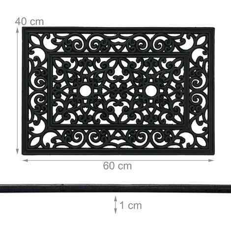 Willkommen auf stylevoller Art! Diese robuste Gummimatte in 60x40cm sorgt für saubere Füße und guten Halt. Mit dekorativen floralen Ornamenten in Schwarz - schick und praktisch zugleich!\\n\\nDie rutschfeste Unterseite hält sicher auf allen Böden. Wetterfestes Gummi verträgt Regen, Schnee und Sonne - perfekt für innen und außen. Einfach zu reinigen - einfach abwischen oder ausklopfen.\\n\\nIdeal für Hauseingang, Terrasse, Garten oder Treppenhaus. Hält Schmutz wirksam fern und sieht dabei noch gut aus. Mit 1.3kg Gewicht liegt sie stabil und verrutscht nicht.\\n\\nDeutsche Markenqualität von Relaxdays - seit über 10 Jahren bekannt für gute Haushaltsprodukte. Mach deinen Eingangsbereich zur stilvollen Visitenkarte - sauber, sicher und schön!