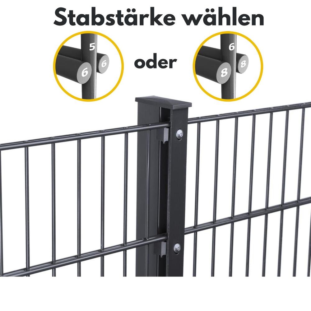 Dieses Doppelstabmattenzaun-Set ist perfekt für deinen Garten! Im 10m Set sind 4 Zaunelemente und 5 Pfosten enthalten - alles was du brauchst. In schickem Moosgrün mit pulverbeschichteter Oberfläche, die vor Rost schützt. Die Stabmatten sind aus feuerverzinkten Drähten (6/5/6 mm) mit 50x200mm Maschenweite. Die 60x40mm Pfosten haben alle 20cm Auflageböcke und kommen mit Pfostenkappen. Extrem stabil und langlebig, dabei total pflegeleicht. Einfache Lieferung mit telefonischer Ankündigung. So bekommst du schnell einen schönen und sicheren Gartenzaun!