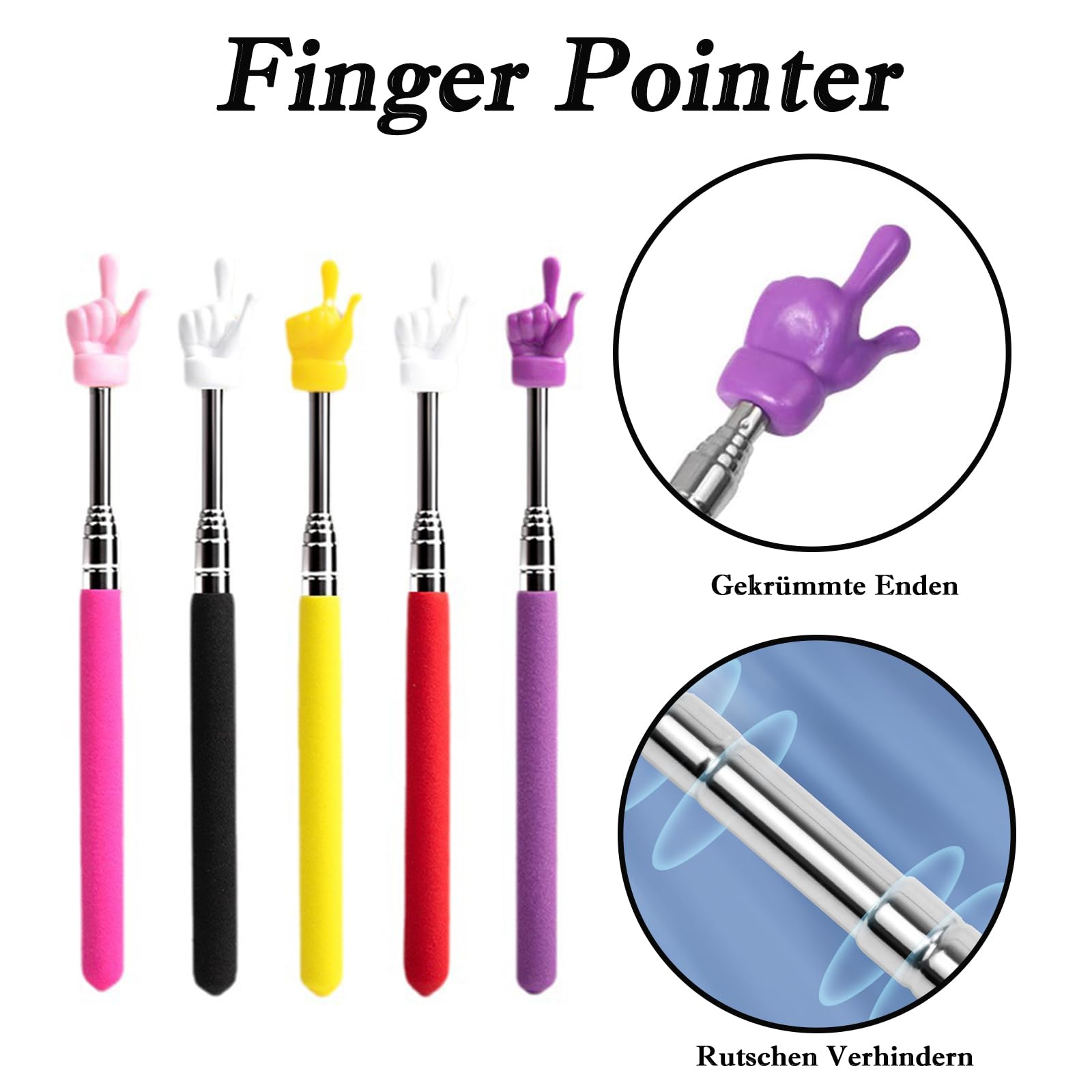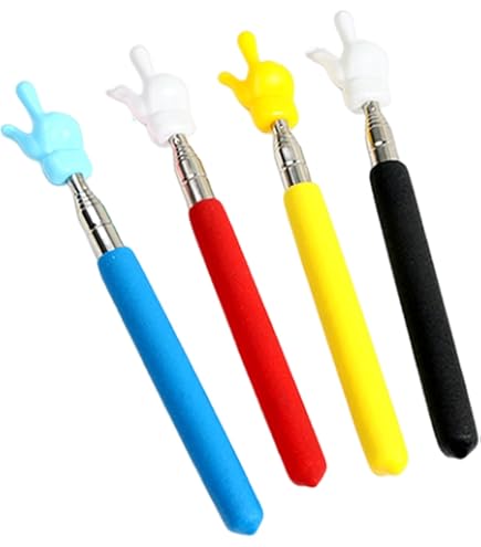 Perfekt für Lehrer, Dozenten und alle, die präsentieren! Dieses 5er-Set Zeigestäbe ist einfach genial. Ausziehbar von 21cm auf 69cm - vier Segmente für flexible Längeneinstellung. In 5 knalligen Farben: Grün, Lila, Blau, Gelb, Rosa. Aus hochwertigem Edelstahl und ABS-Kunststoff - rostfrei, bruchfest und langlebig. Der mattiere Griff liegt angenehm in der Hand und rutscht nicht. Die coole Fingerform ist aus der Ferne gut sichtbar und weckt Aufmerksamkeit. Ideal für Unterricht, Vorträge, Konferenzen, Messen oder sogar Eltern-Kind-Interaktionen. Leicht und faltbar - super zum Verstauen und Mitnehmen. Einfach ausziehen, zeigen, wieder einklappen. Mit diesen Zeigestäben machst du jede Präsentation lebendiger und interessanter. Einfach bestellen und professioneller präsentieren!