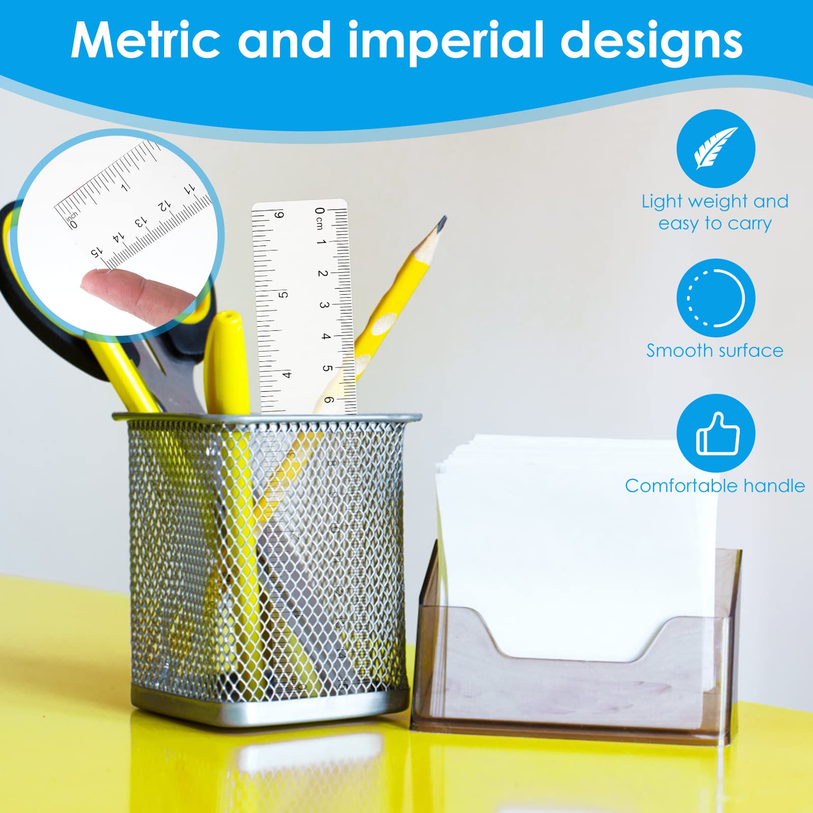 Lineale gehen immer kaputt oder sind nicht da, wenn man sie braucht? Mit diesem 6er-Set hast du immer Ersatz parat! Jedes Lineal ist 15 cm lang, aus flexiblem Kunststoff und in verschiedenen transparenten Farben gehalten. So kannst du Linien und Maße supergenau ablesen, ohne die Unterlage zu verdecken. Perfekt für die Schule, das Büro oder Bastelprojekte zu Hause. Die Lineale sind robust, brechen nicht so leicht und passen in jedes Federmäppchen oder jede Schublade. Ob für Geometrie, Zeichnungen oder zum Unterstreichen – hier ist für jede Aufgabe das passende Lineal dabei. Die bunten Farben machen nicht nur Spaß, sondern helfen auch, die Lineale schnell zu unterscheiden. Ideal für Kinder, Studenten, Künstler oder Hobbyhandwerker. Einfach praktisch, langlebig und preiswert – hol dir das Set und mach Messen zum Kinderspiel!