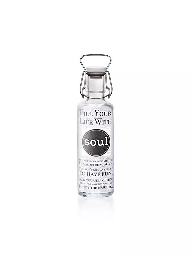Trinkwasser trinken und dabei Gutes tun - mit der soulbottle 0,6l wird's einfach! Diese wunderschöne Glasflasche mit 'Flower of Life' Design ist nicht nur ein Hingucker, sondern auch komplett plastikfrei, vegan und klimaneutral. Hergestellt in Berlin aus 60-80% Altglas - nachhaltiger geht's kaum! Die 29mm große Öffnung ist perfekt zum Trinken ohne Nasenstüber, und der praktische Tragegriff macht sie zum idealen Begleiter für unterwegs. Dank Naturkautschuk-Dichtung ist sie absolut auslaufsicher und spülmaschinenfest (bis auf Gold- und Silberdruck). Das Beste: Für jede verkaufte Flasche geht 1€ an Trinkwasserprojekte von Viva con Agua - bisher konnten schon über 80.000 Menschen mit sauberem Wasser versorgt werden. Mit 26cm Höhe und 7,5cm Durchmesser passt sie in jede Tasche. Mach Schluss mit Plastikflaschen und tu dir und der Umwelt etwas Gutes!